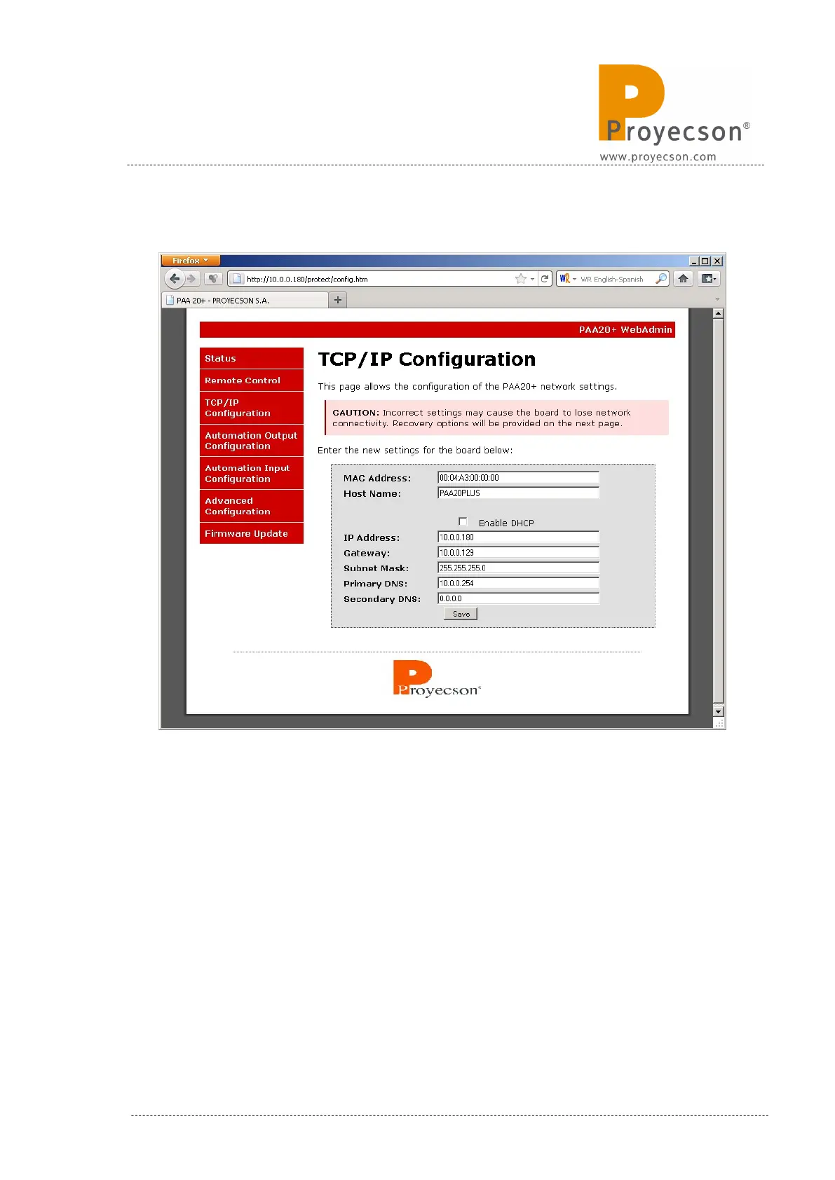 In this page you can configure the TCP/IP interface of the PAA20+. The