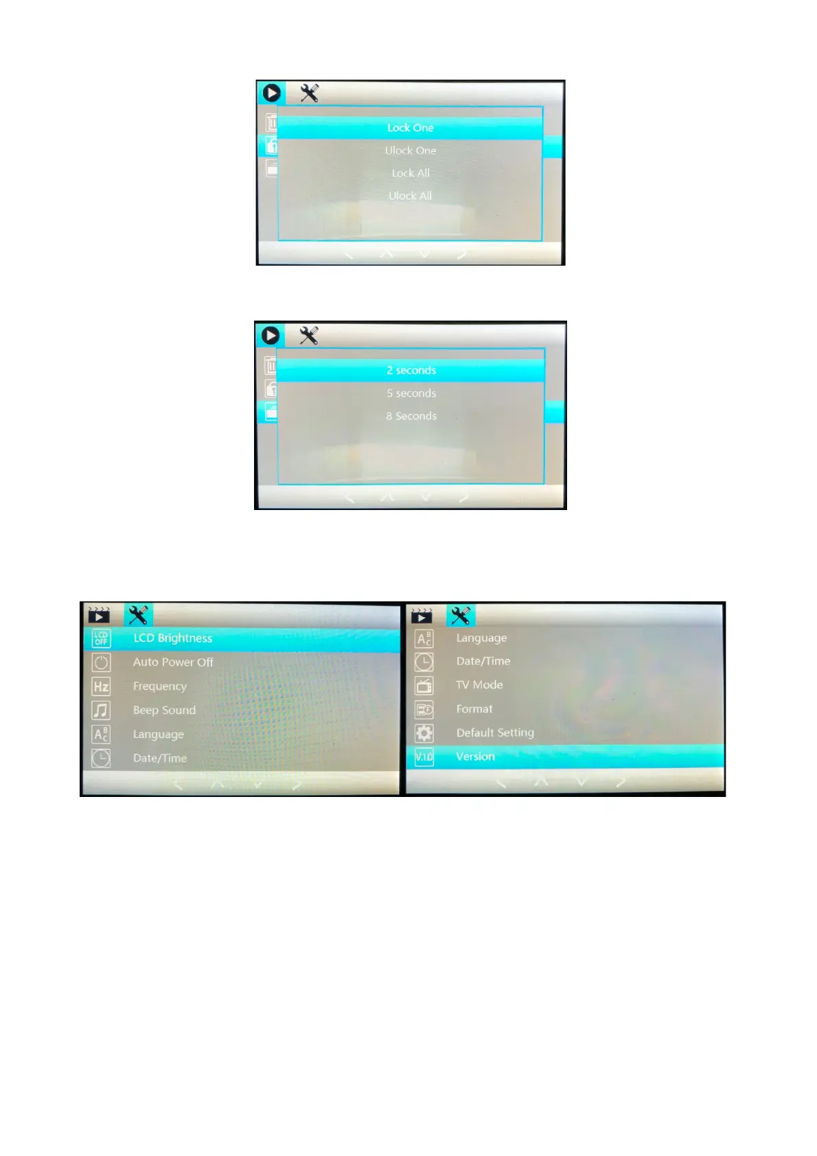 SETTINGS MENU: From any of the previous Menus, press the menu button a second time to go