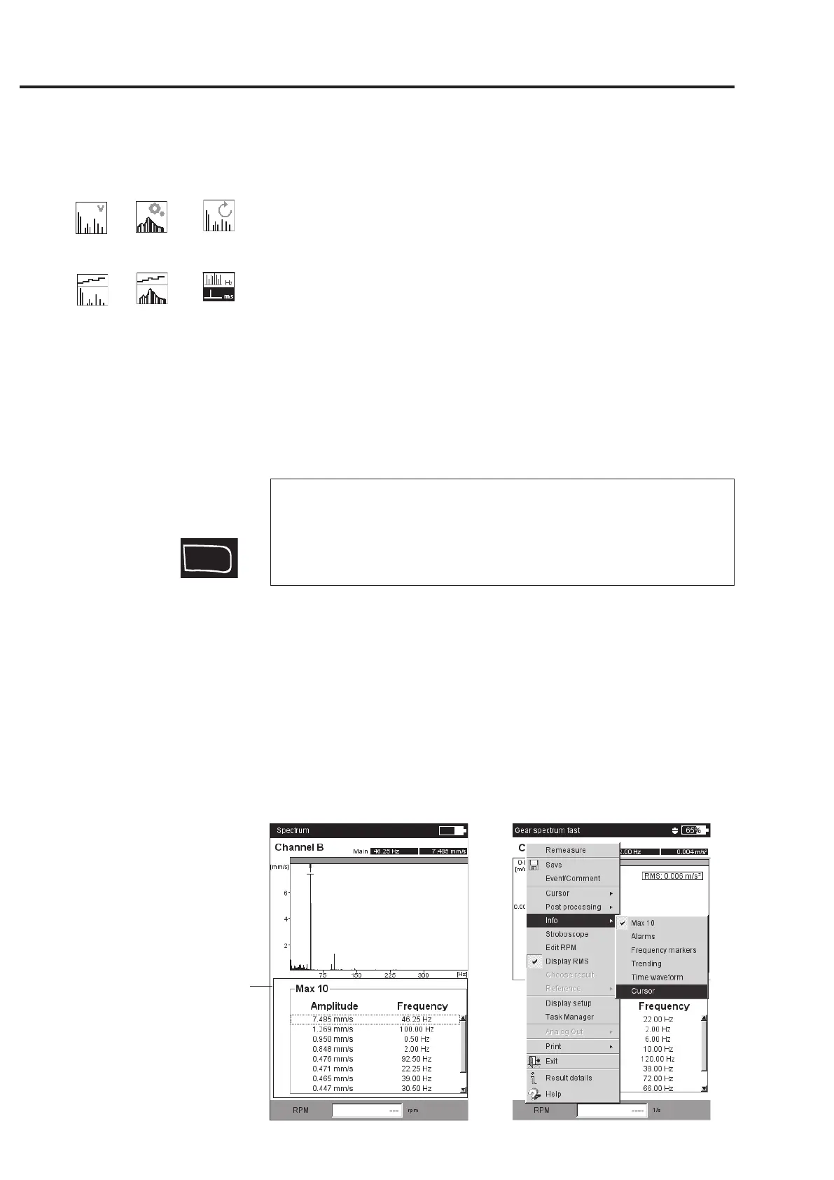 Lists the 10 highest amplitudes in the spectrum. Click on an entry to