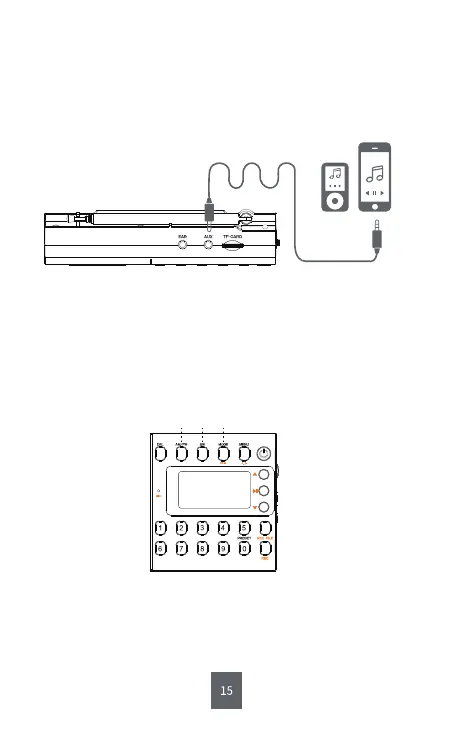 Step1: Insert one end of the AUX cable into “AUX” jack of the radio and