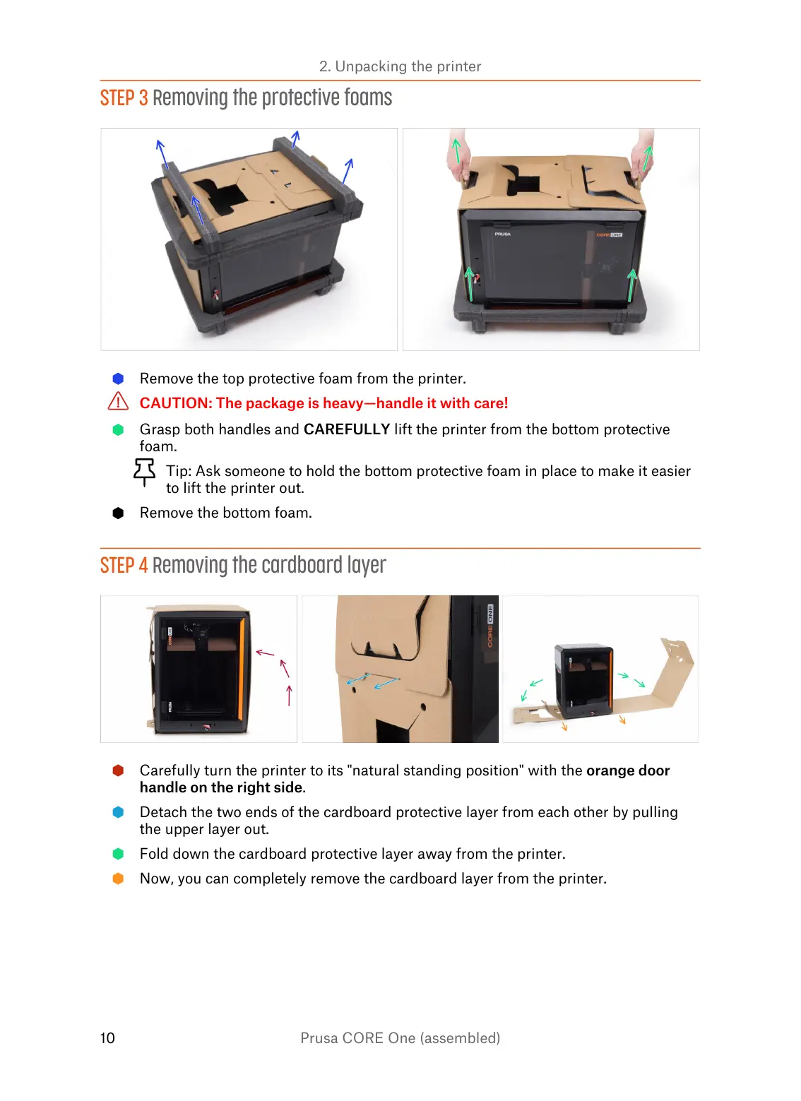 Grasp both handles and CAREFULLY lift the printer from the bottom protective