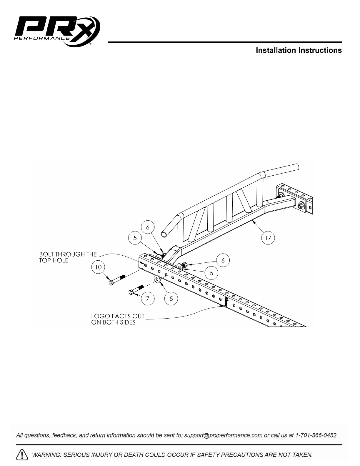 Using the 4” hex head bolts (10) 5/8” washers (5), and 5/8” lock nuts (6), attach the Multi-Grip Bar