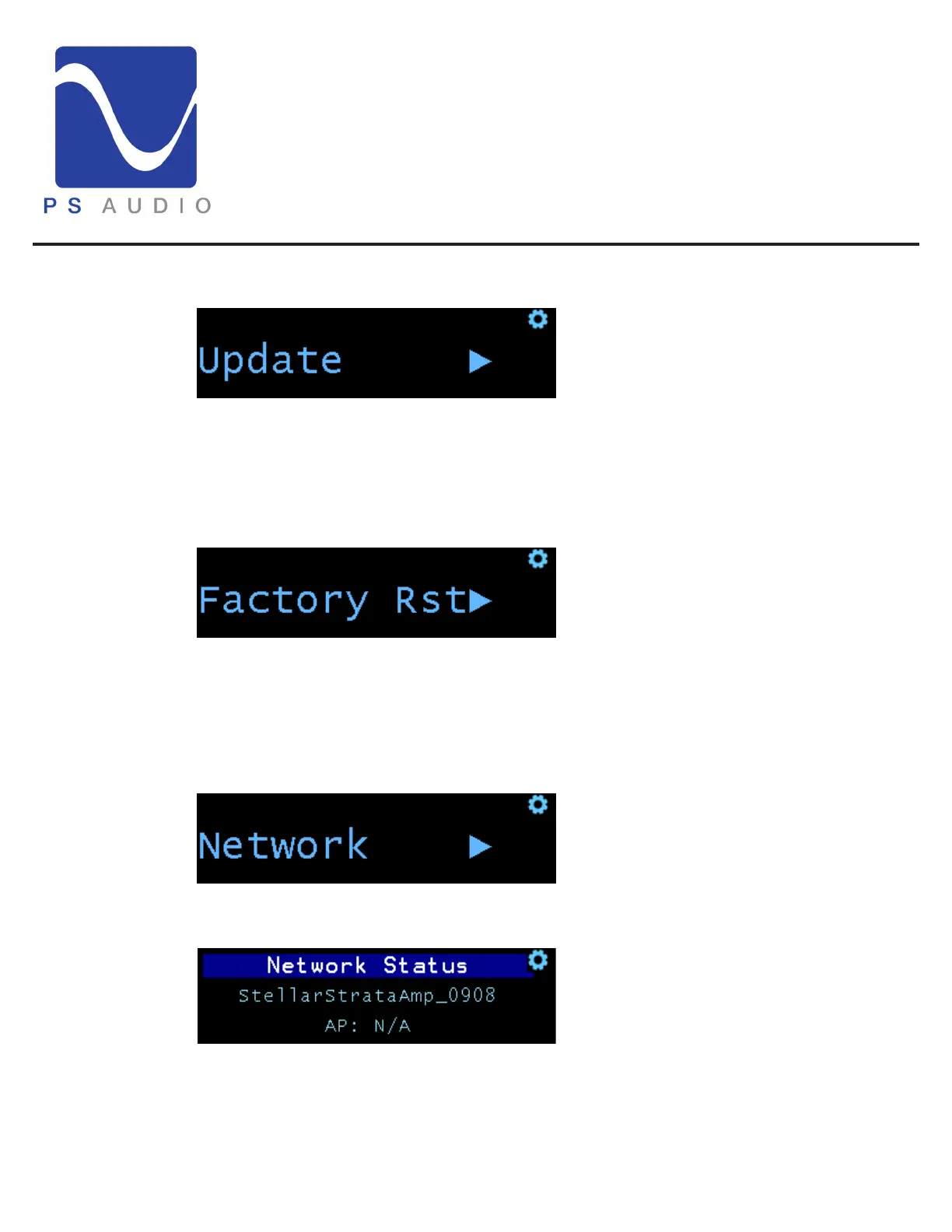 Fi, IP address, and connection status. is menu is information only, there are no settings.