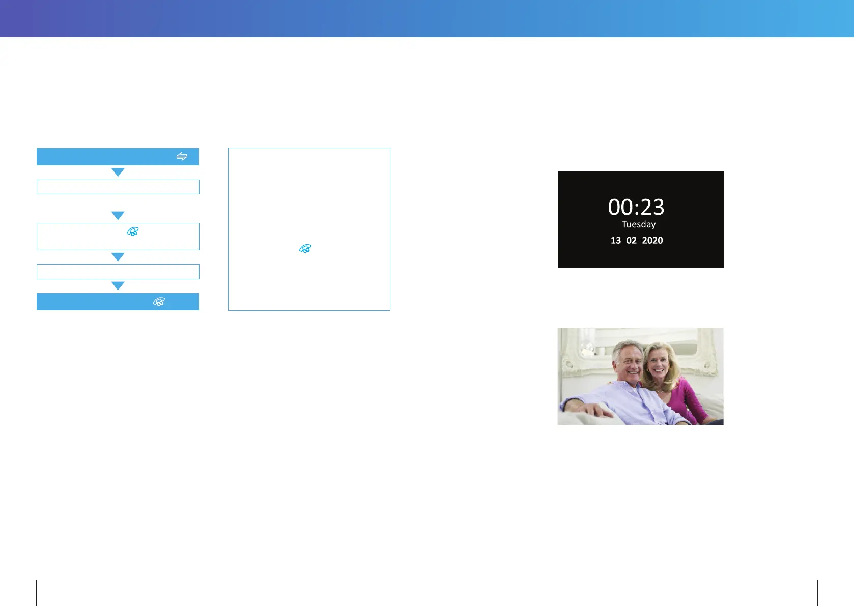 There are 2 mode options during standby mode: Clock and Date mode or Digital Photo