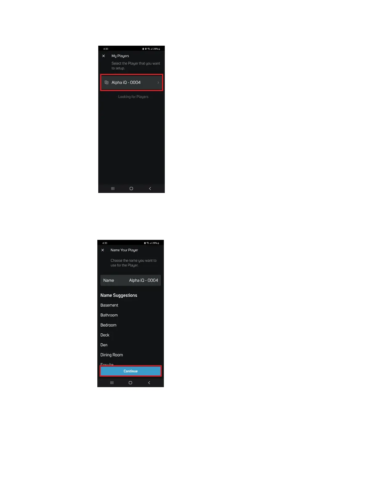 5. Select the Primary Speaker’s unique network ID (“Alpha iQ-0004” in this example) from the Needs Setup or My Players App screen.