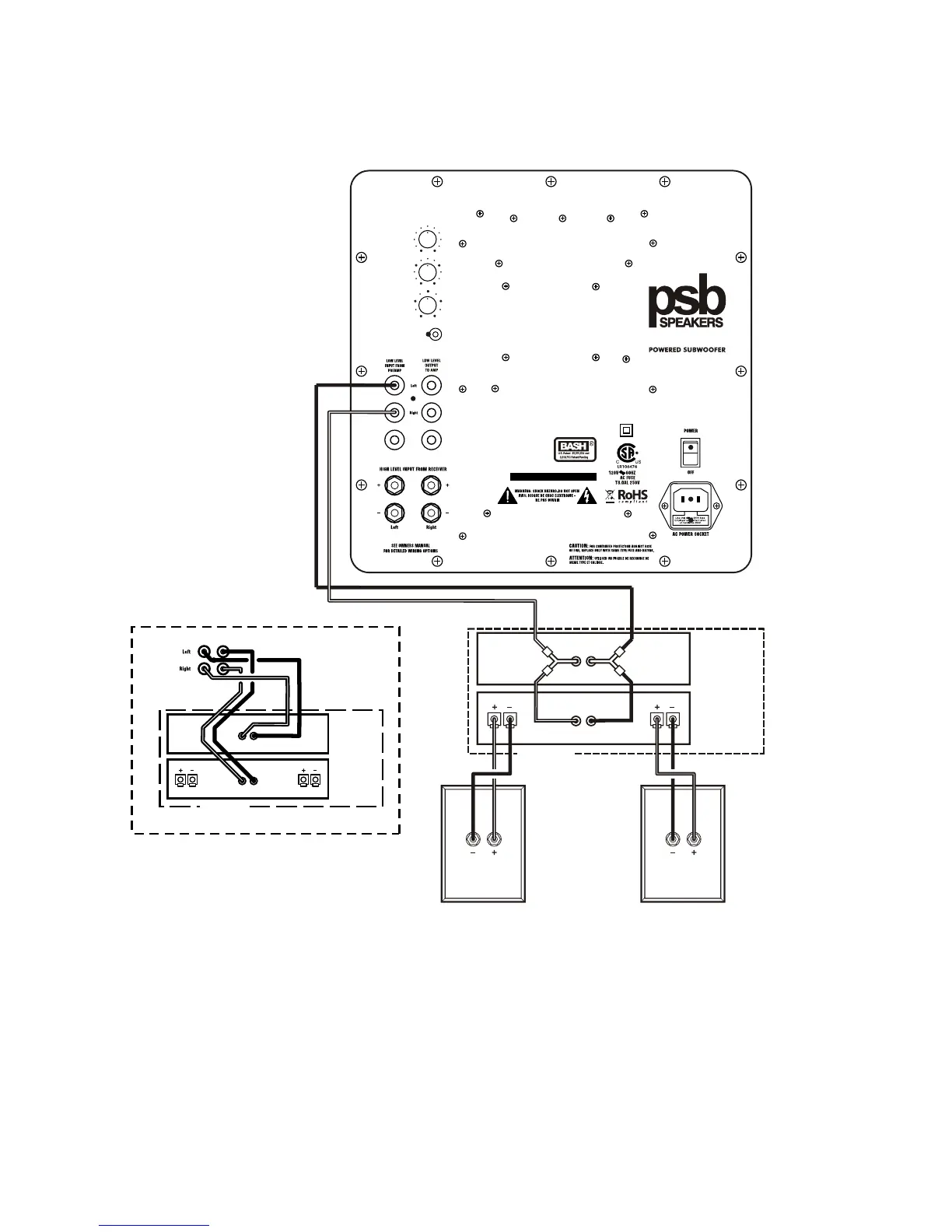 Low level connections wire the subwoofer to a preamplifier or to the "pre-out" jacks of an integrated amplifier or receiver, using