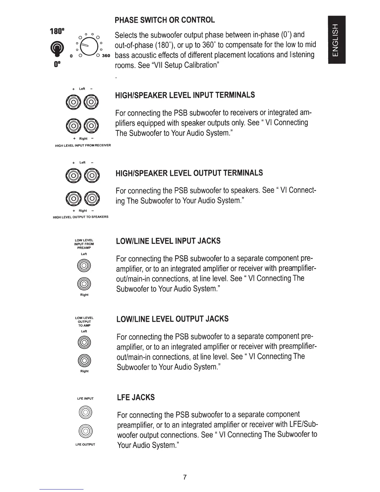 PSB Powered Subwoofers - Phase Adjustment Control; High;Speaker Level Input Terminals; High;Speaker Level Output Terminals; Low;Line Level Input Jacks