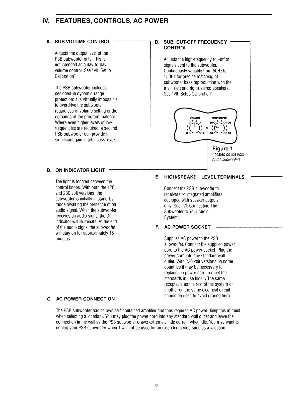 PSB SubSeries 1 - Sub Volume and Cut-Off Frequency Controls; On Indicator Light Function; AC Power Connection and Socket; High;Speaker Level Terminals