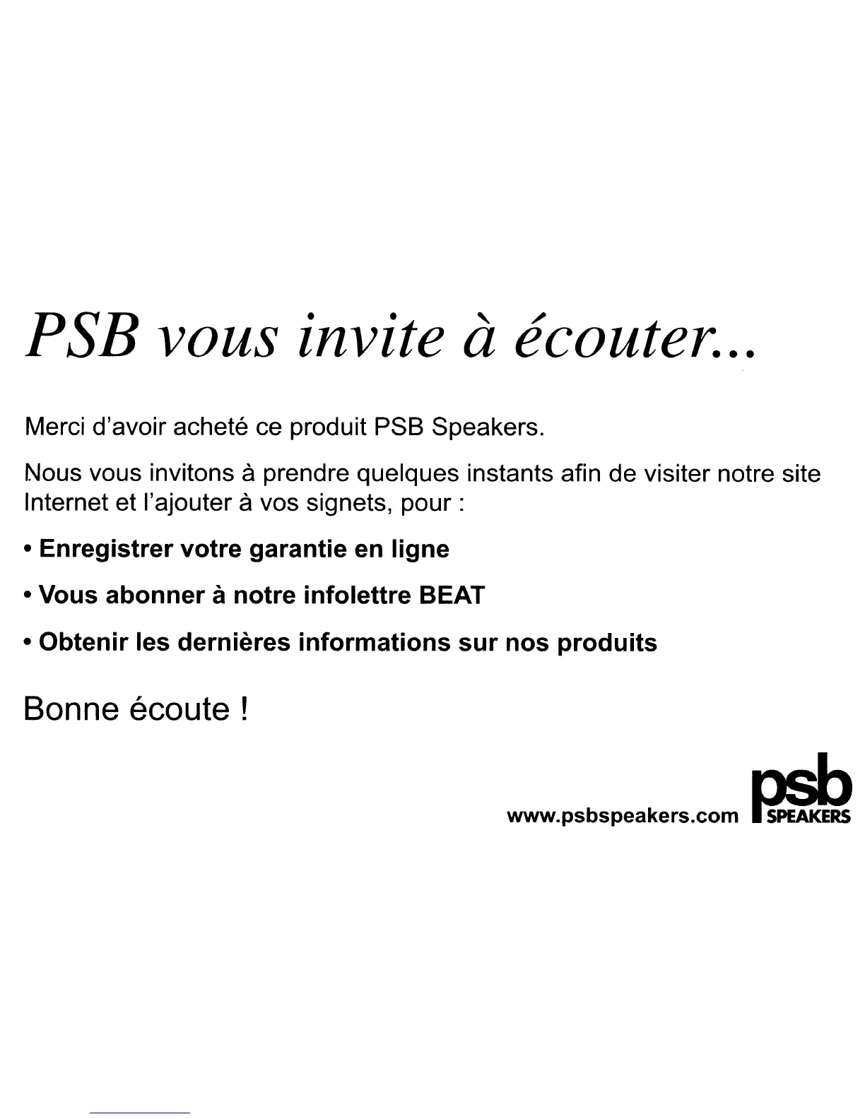 Merci d'avoir achete ce produit PSB Speakers.