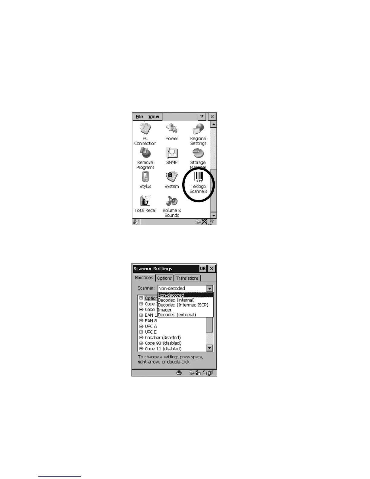 The Teklogix Scanners icon in the Control Panel provides dialog boxes in