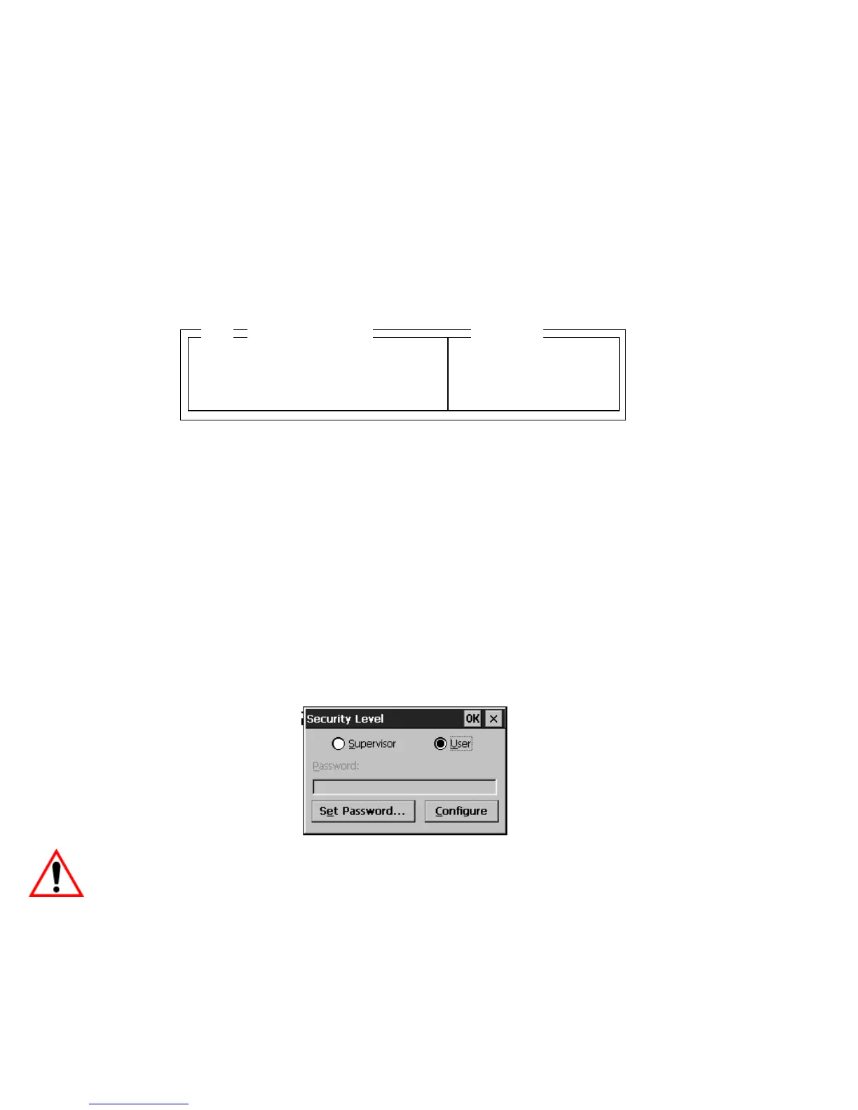 either a Supervisor or a Teklogix level password. The default security level is User.