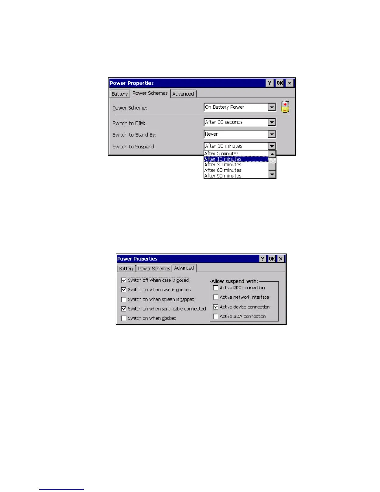 The Advanced tab of the Power Properties dialog contains settings that govern when