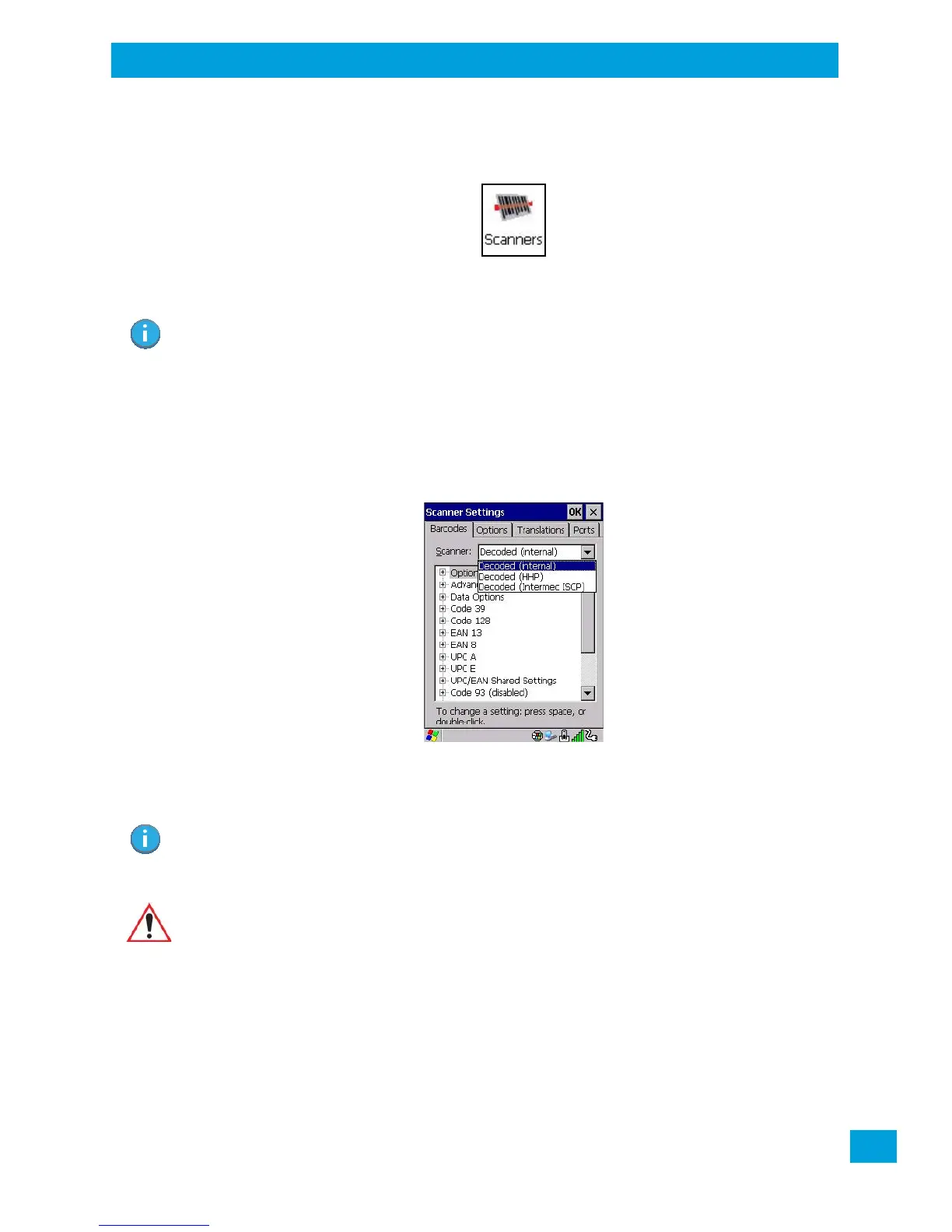 The Scanners icon in the Control Panel provides dialog boxes in which you can tailor barcode scanner con-