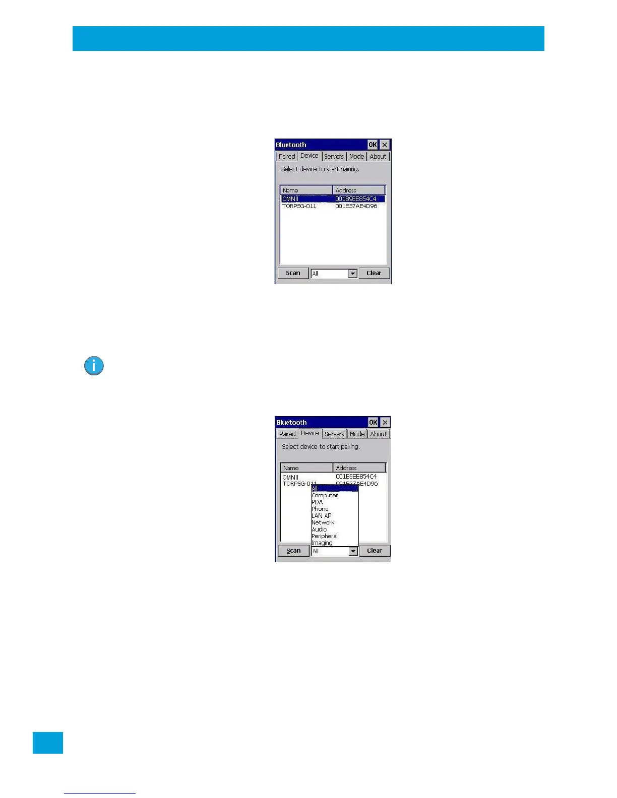 Scan discovers Bluetooth devices in range of the Omnii and lists them in this tab. Any existing devices previ-