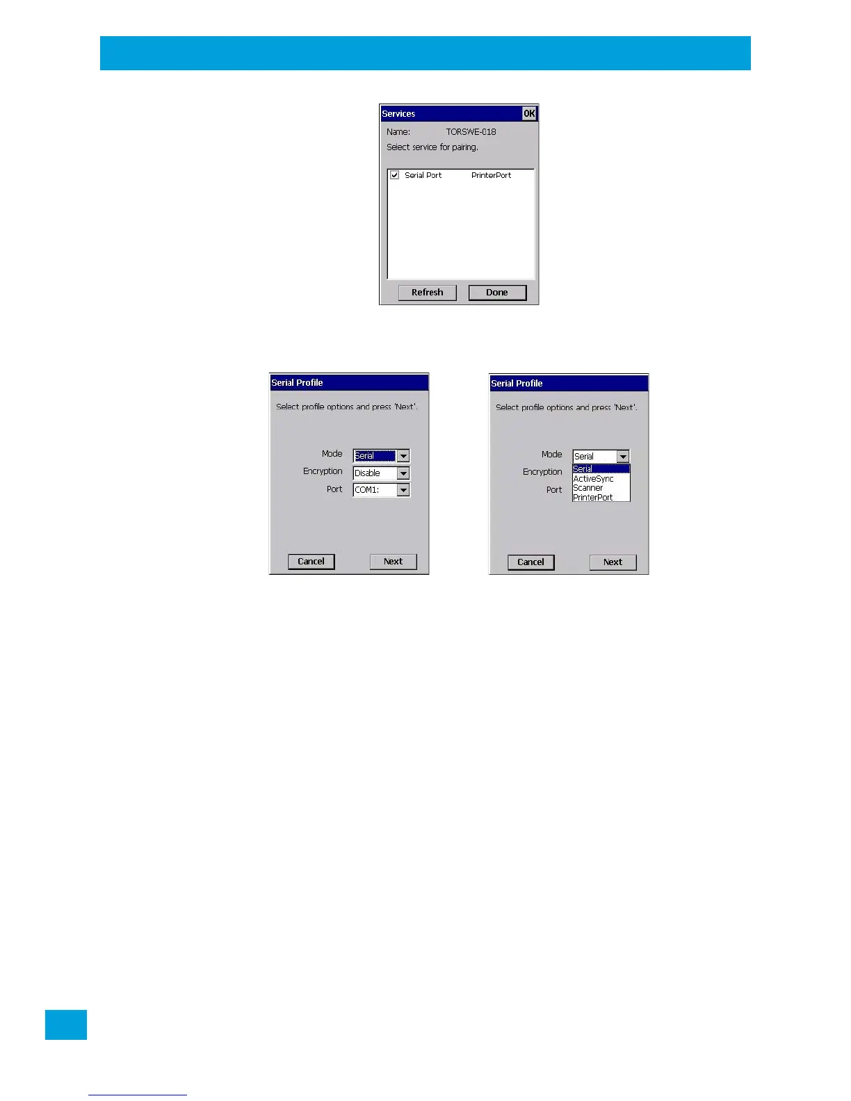 ent Modes: Serial, ActiveSync, Scanner, and Printer Port.