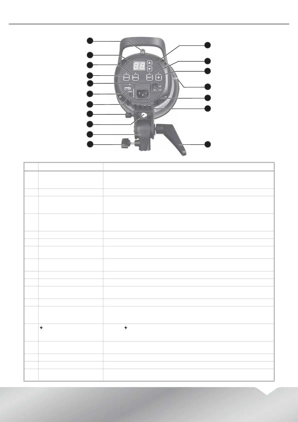 2 Digital display Displays the brightness level of the flash or modeling lamp.