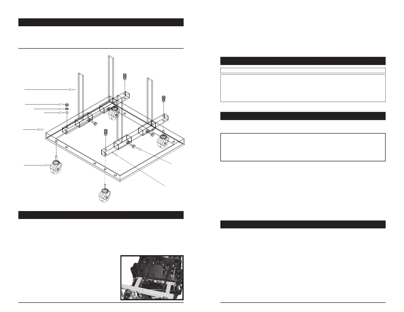 3. Attach casters (1) through frame (2) and cross-braces (3), with nut