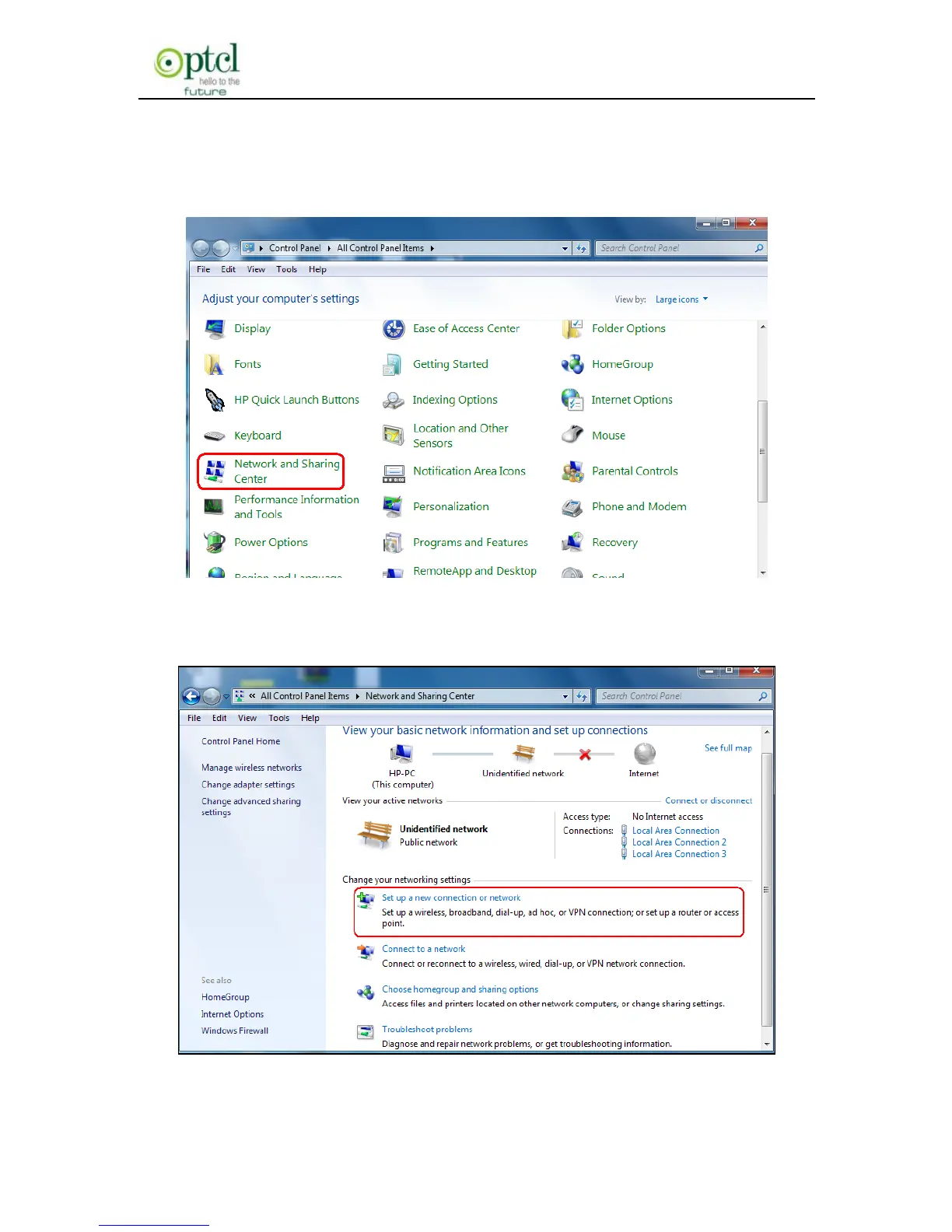 c) Enter Network and Sharing Center and select Set up a new