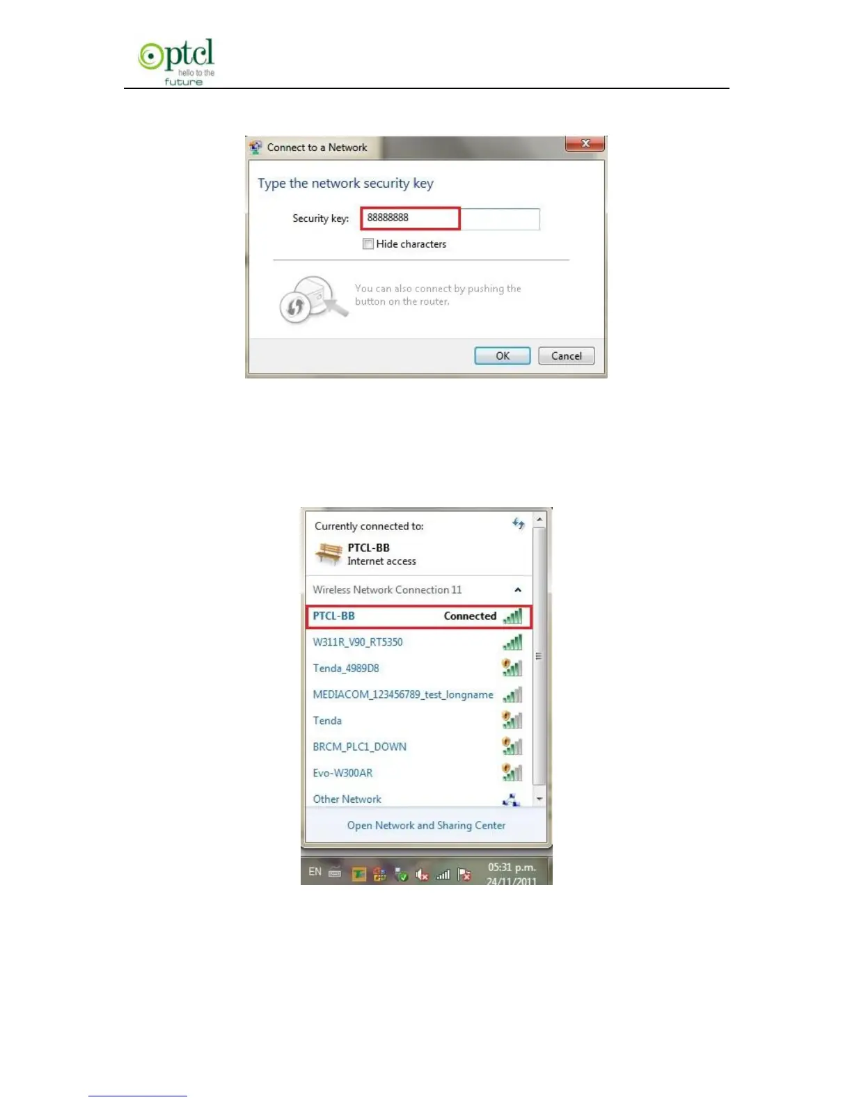 Then click ―PTCL-BB select ―Connect‖ to go to the dialogue box below: