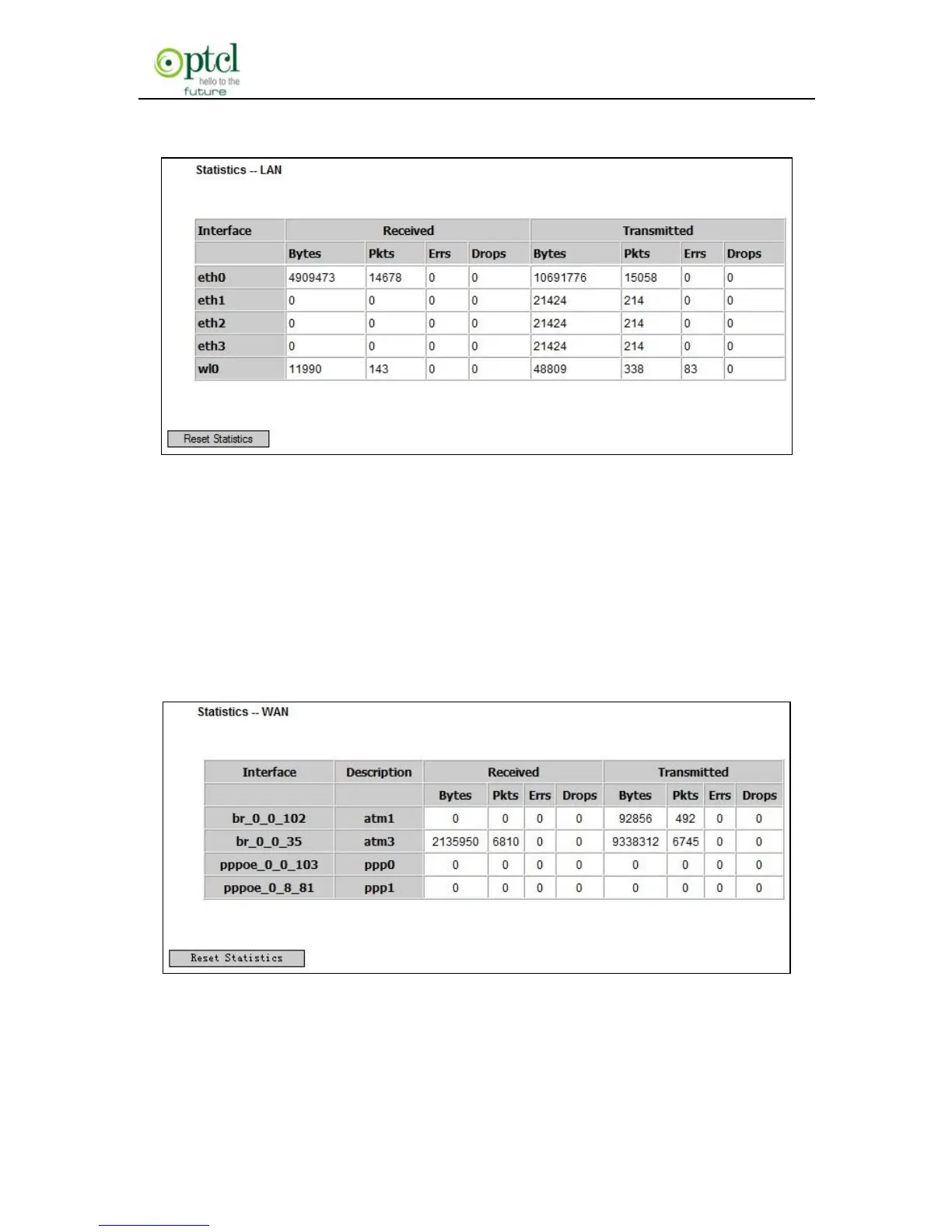 Statistics—WAN: It displays the received and transmitted packets of