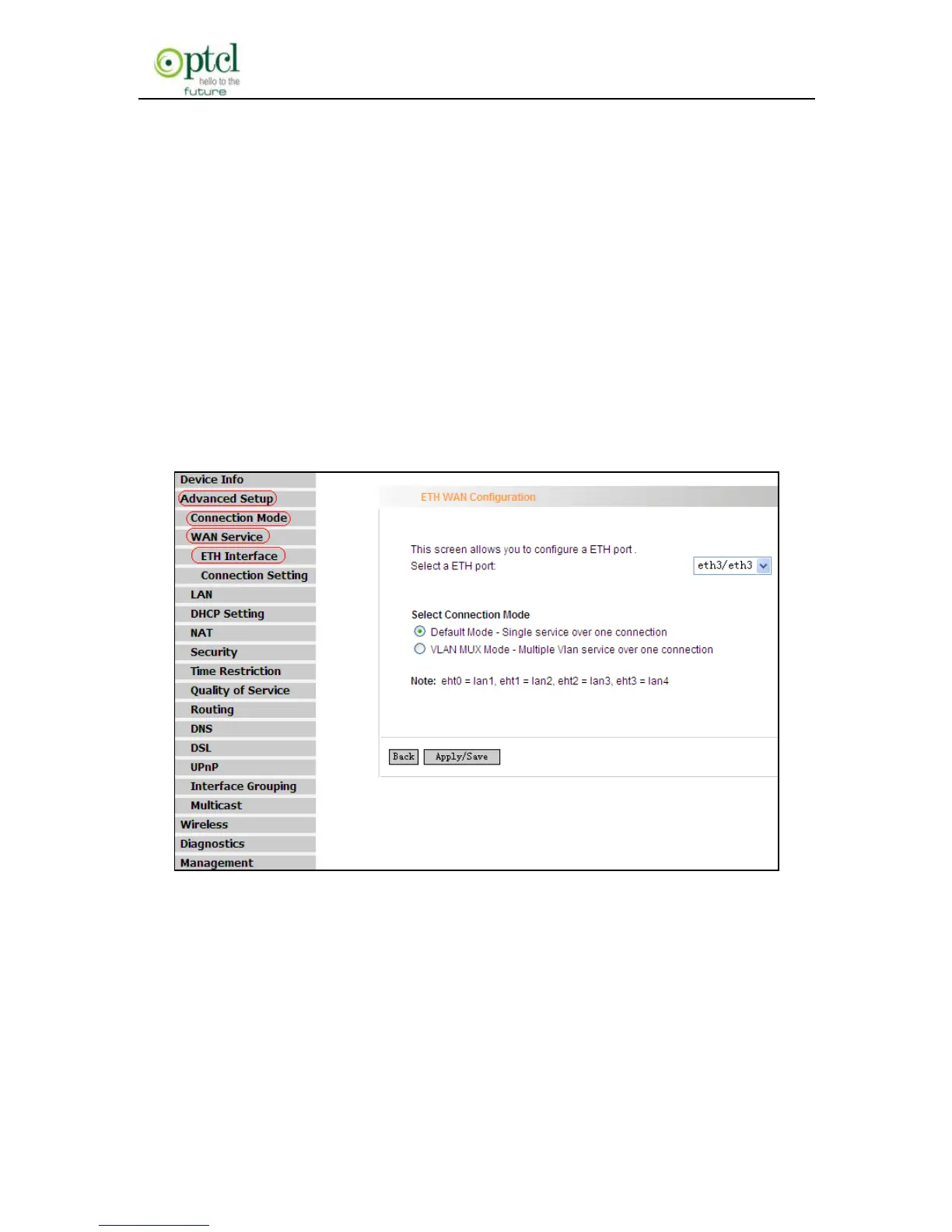 To enter the ETH Interface page, click ―Advanced Setup‖---―Connection