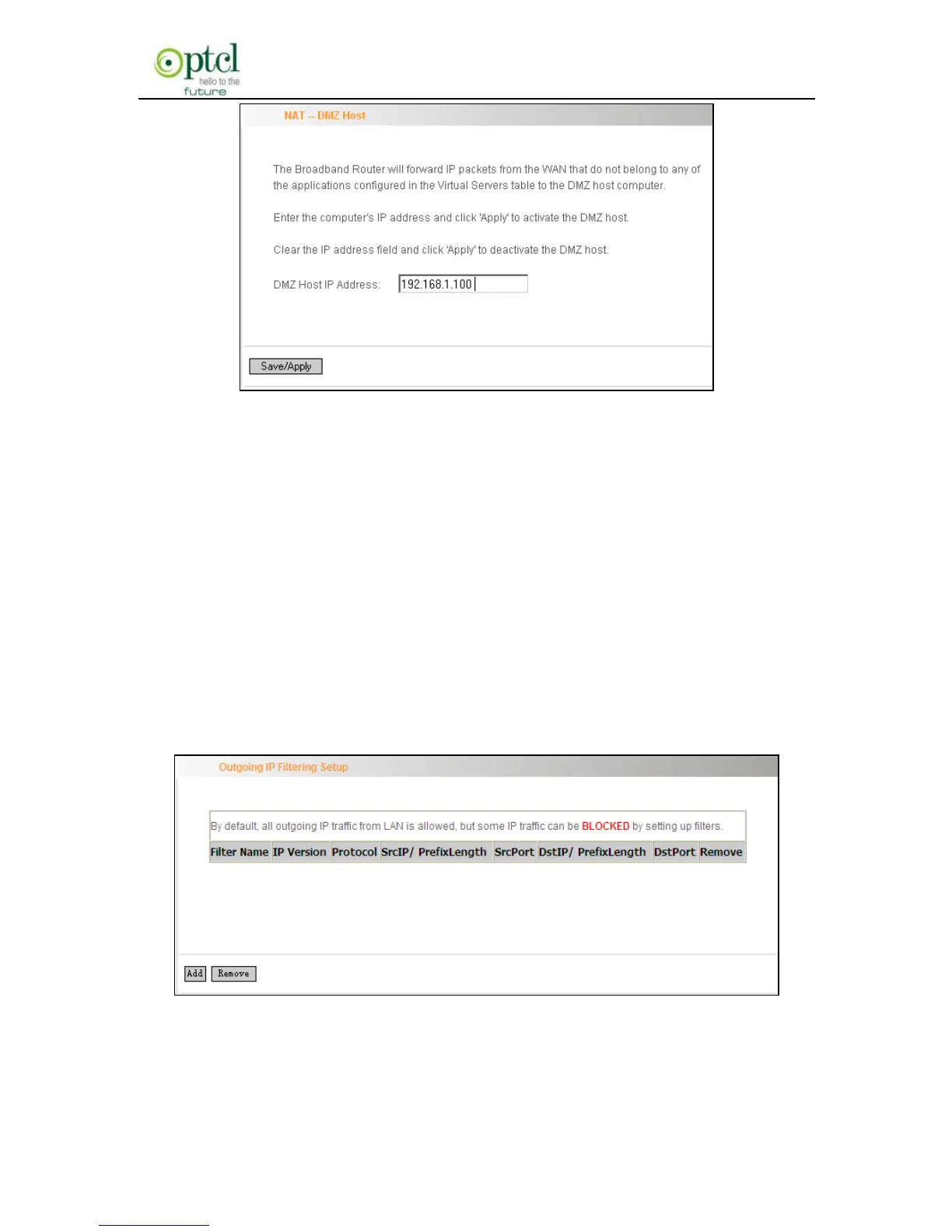 1) Click ―Advanced Setup‖ → ―Security‖ → ―IP Filtering‖ to display the