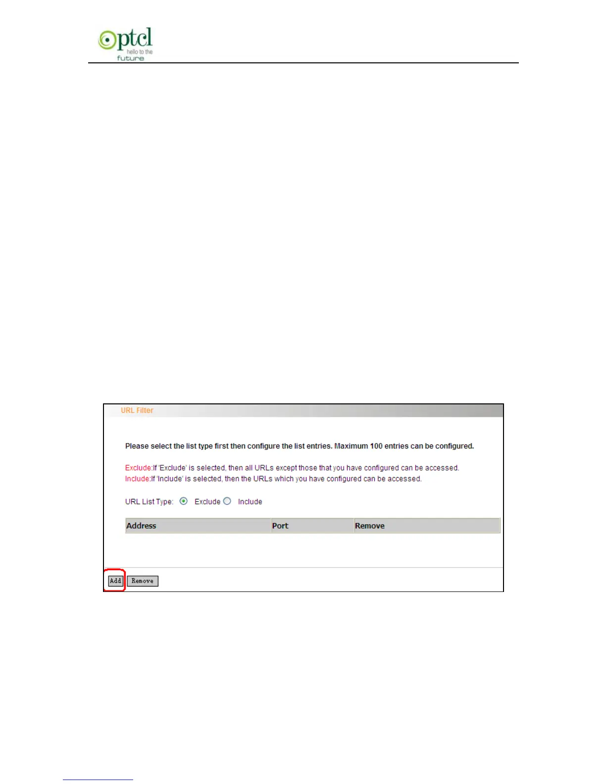Click ―Advanced Setup‖―Security‖―URL Filter‖ to the page above