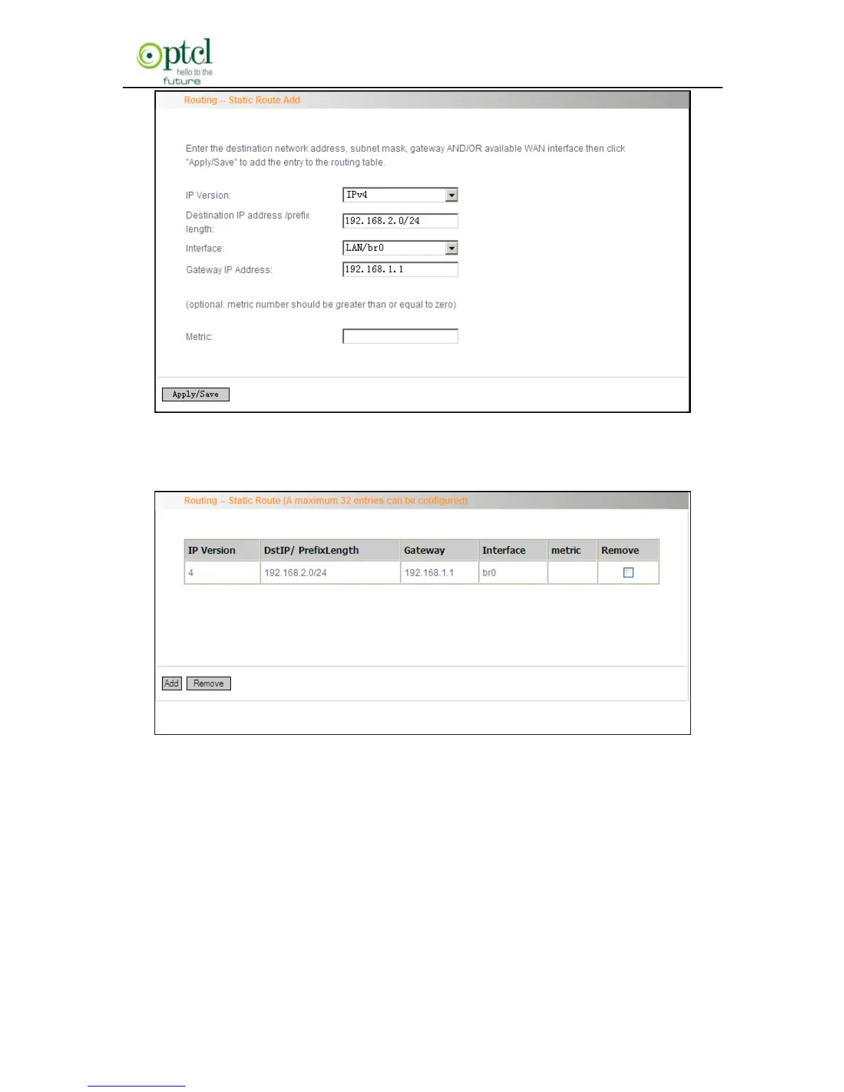 Click ―Apply/Save‖ to display the current configured static route
