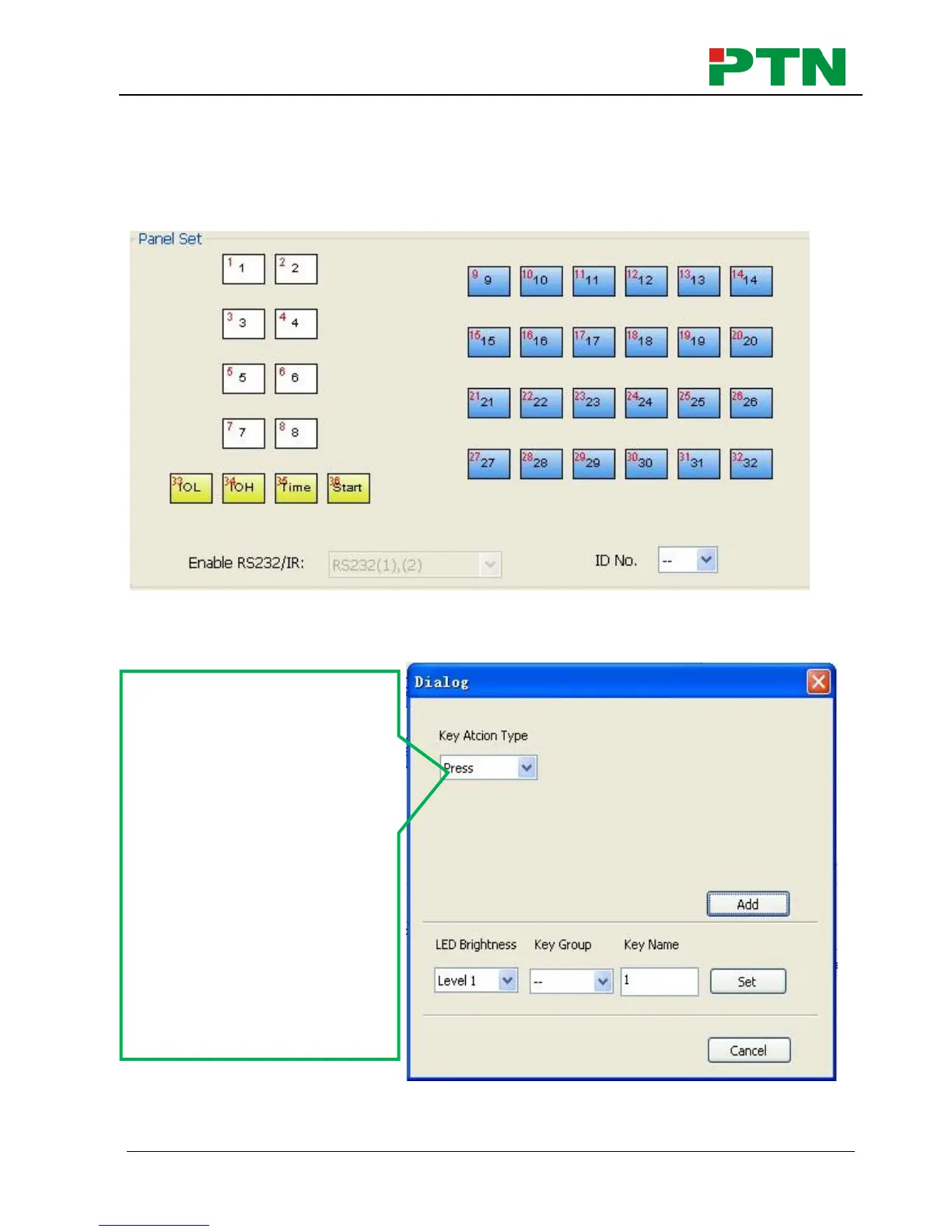 There are three different colors of keys in the panel set of PS-WP. Add a key action to