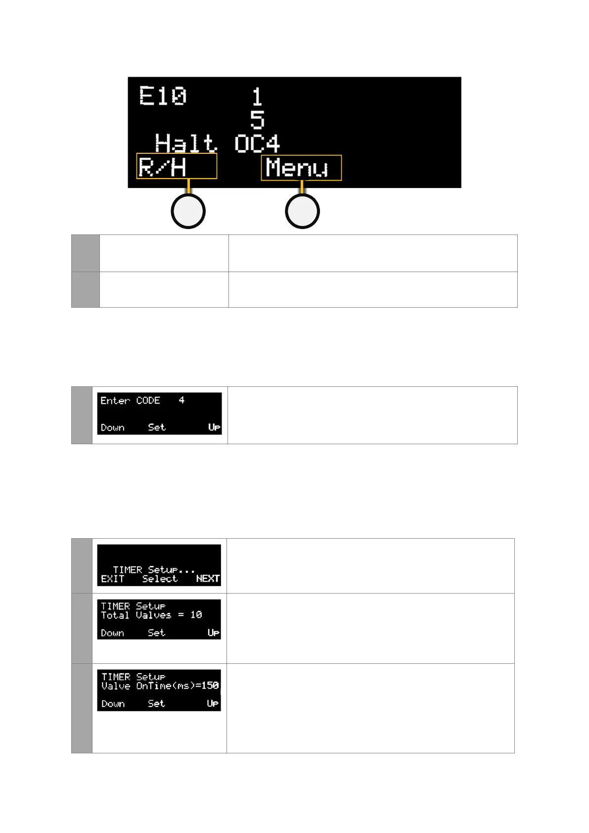 sequencing, the pulse on and off times. Keep pressing NEXT until the TIMER Setup page is