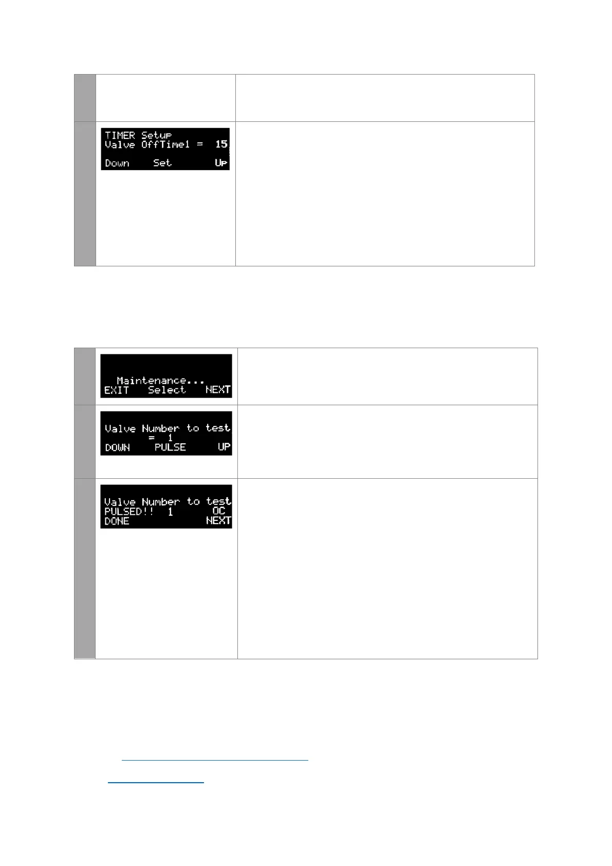 Maintenance mode allows the user to manually pulse and test the valves. Keep pressing