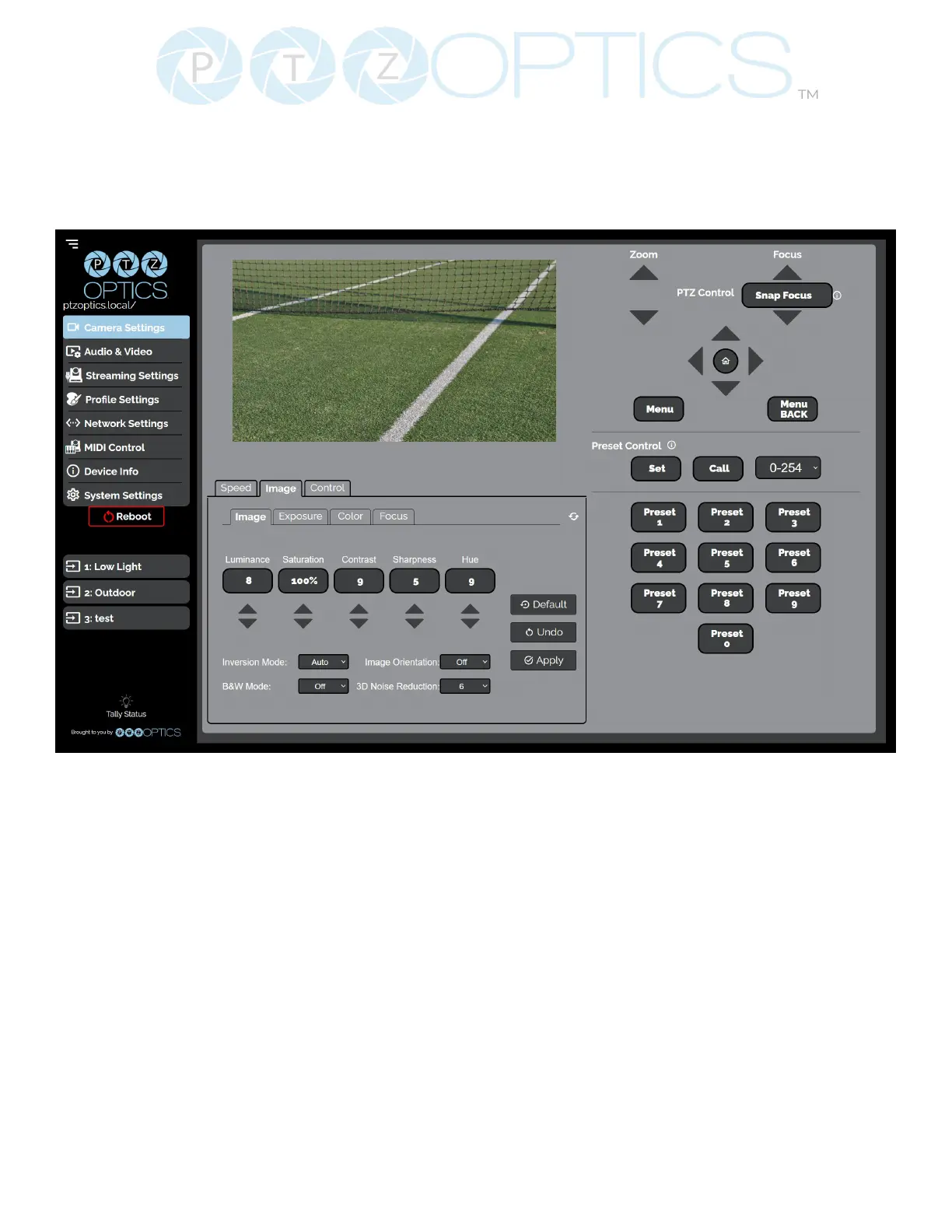 The Image > Image tab within the Camera Settings page allows you to adjust the camera’s