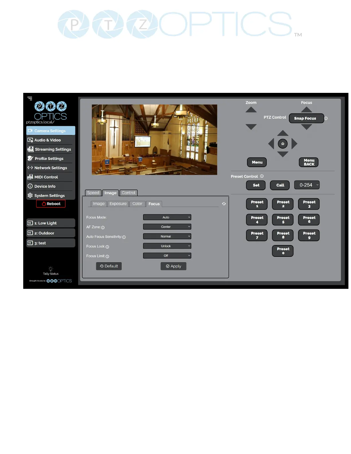 ▪ You must click the “Apply” button to save the Focus settings to the camera.