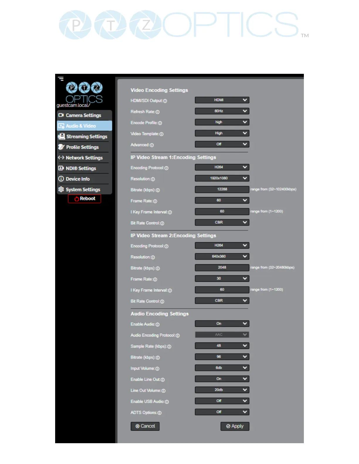PTZOptics Move 4K - Audio Video Settings; Video Encoding and IP Stream Settings; Audio Encoding Settings