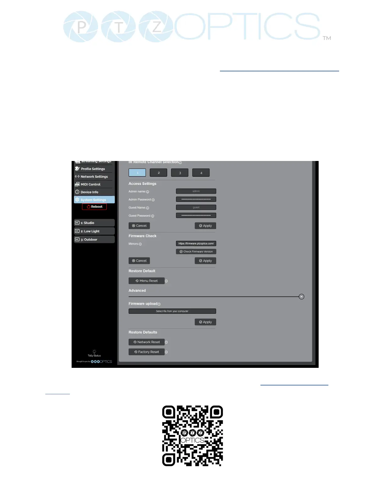 Ŝ Mirrors: Dene a server address for acquiring the latest PTZOptics rmware les. By