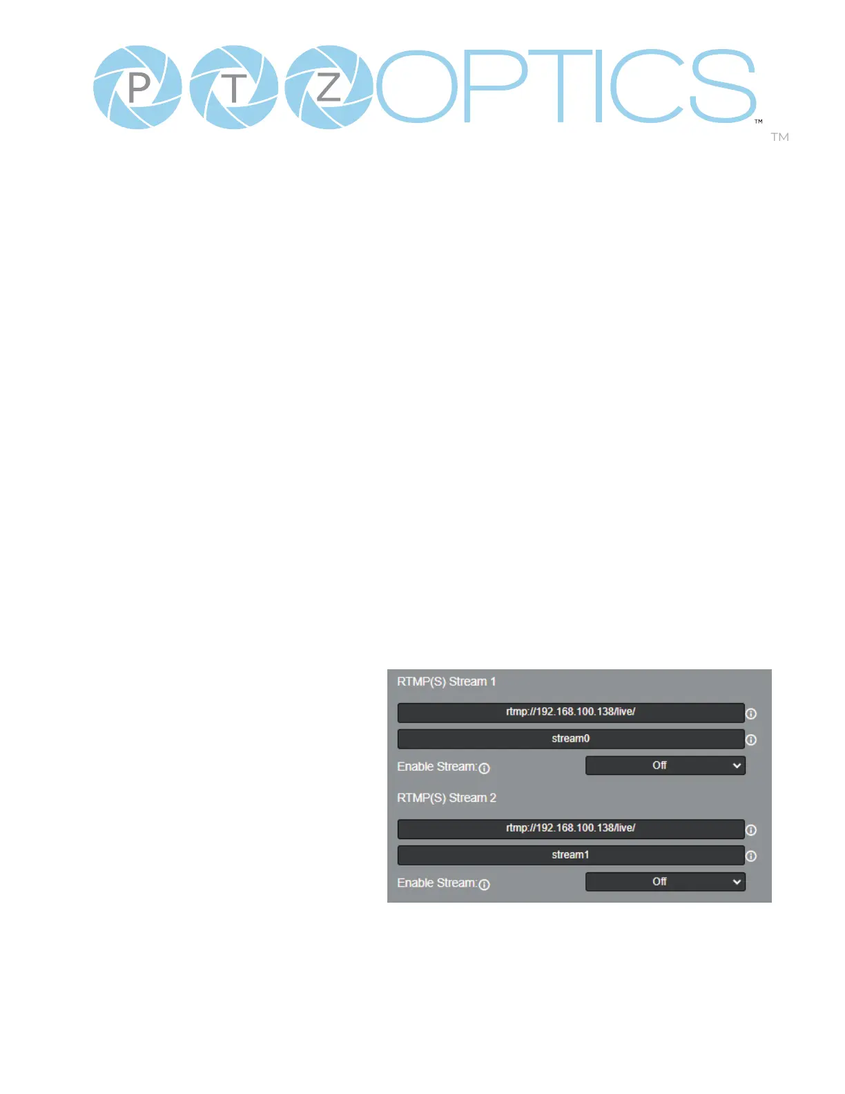 Your camera can send two (2) RTMP(S) streams. To send the camera’s video feed