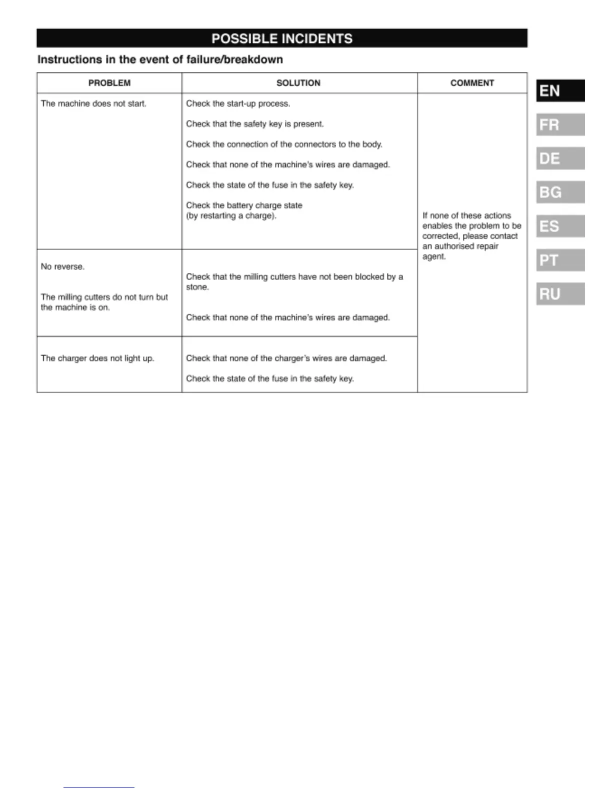 Pubert TILLENCE - Troubleshooting Common Incidents; Machine Start-up Issues; Reverse Gear Problems