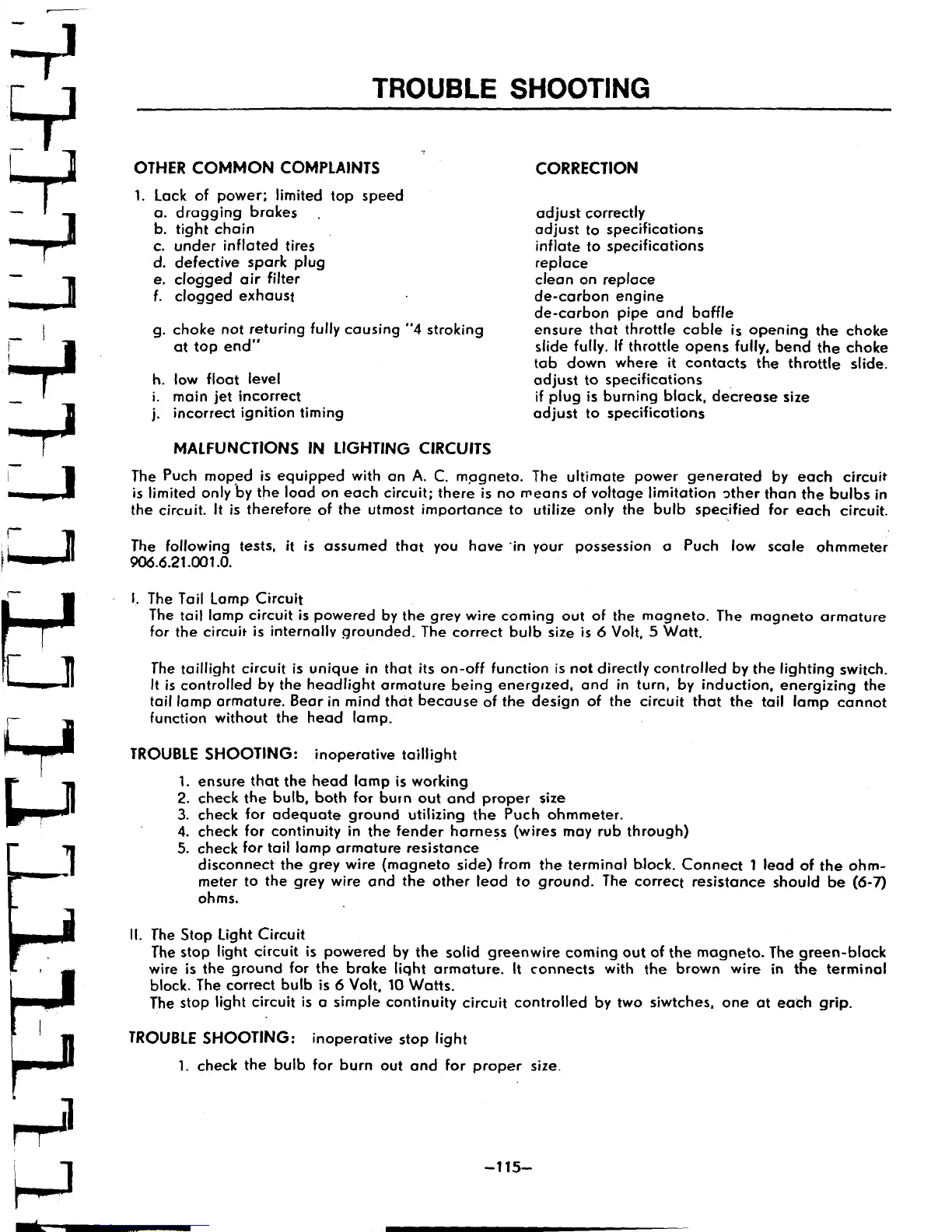 Puch Maxi 50 - Malfunctions in Lighting Circuits; Other Common Complaints; Inoperative Taillight; Inoperative Stop Light