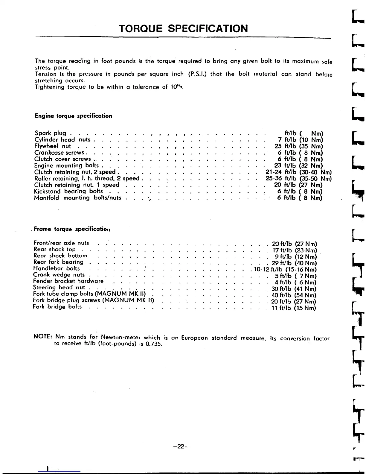 Puch Maxi 50 - Torque Specifications; Engine Component Torque Settings; Frame Component Torque Settings