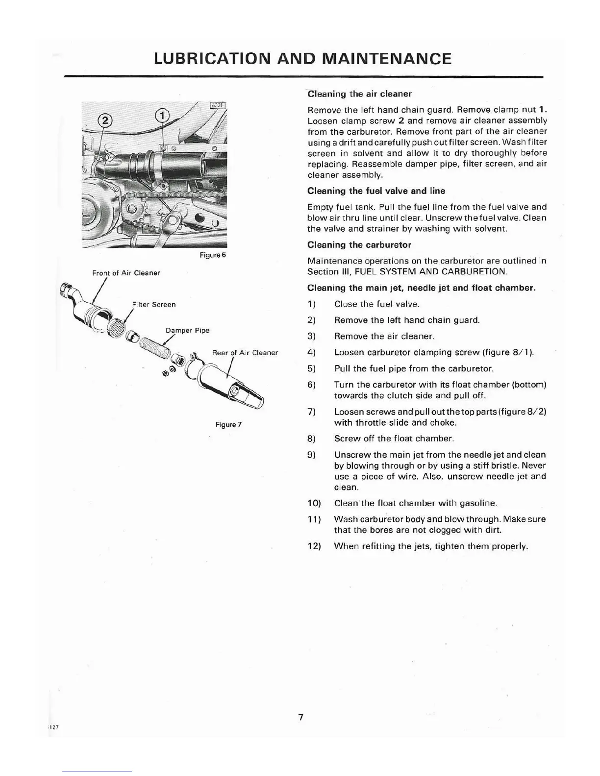 Puch murray - Cleaning the Air Cleaner; Cleaning the Fuel Valve and Line; Cleaning the Carburetor; Cleaning the Main Jet, Needle Jet and Float Chamber