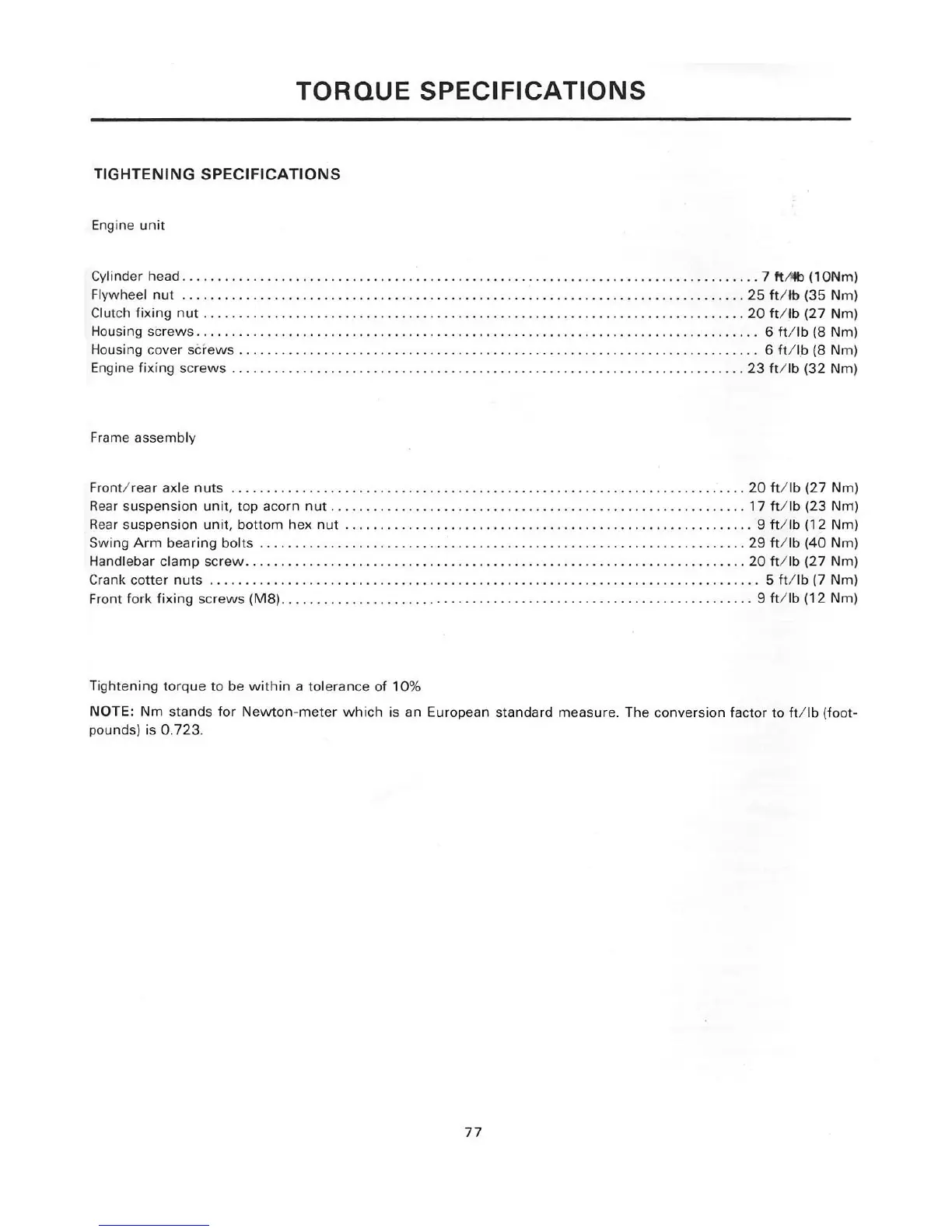 Puch murray - Torque Specifications; Tightening Specifications; Engine Unit