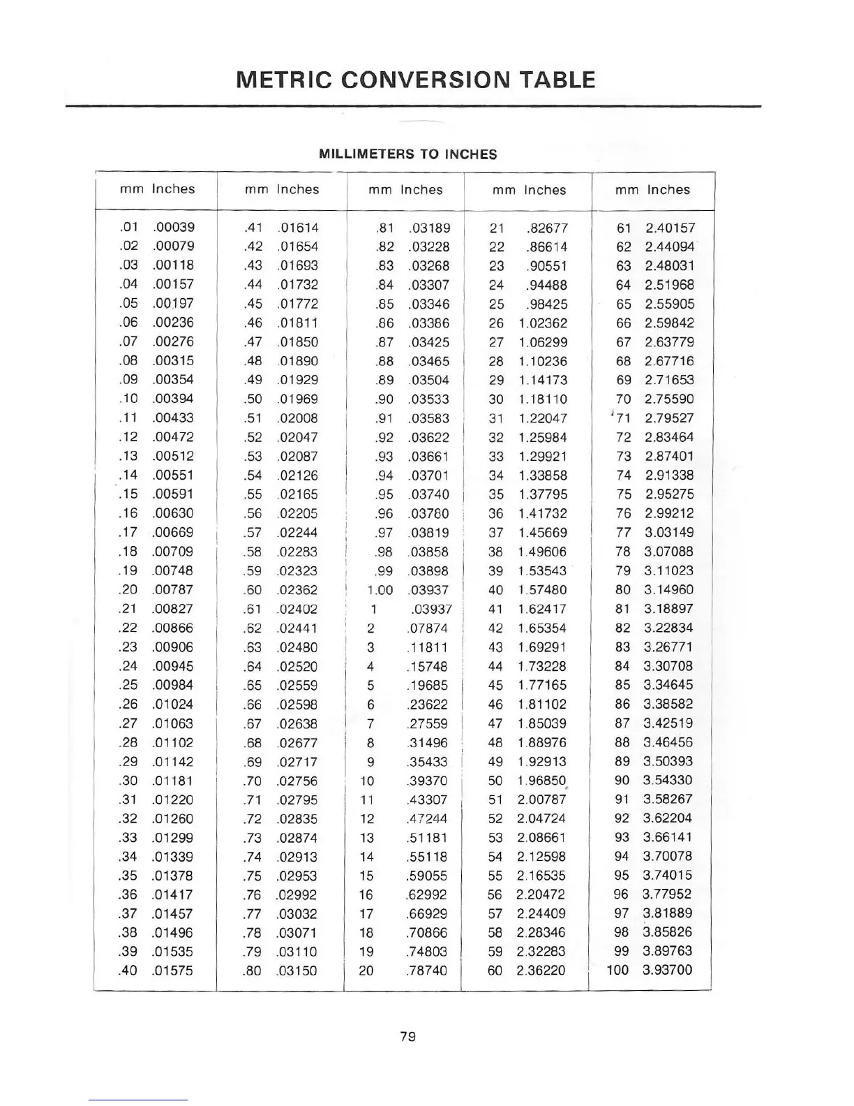 Puch murray - Metric Conversion Table; Millimeters to Inches