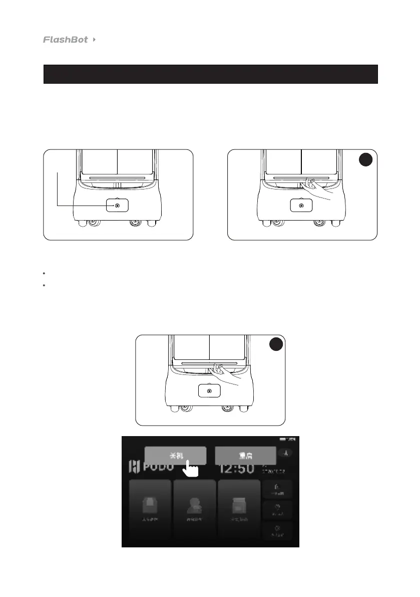 长按开关机键 3秒,点击屏幕上的“关机”按键,灯光和屏幕熄灭,机器人关机。