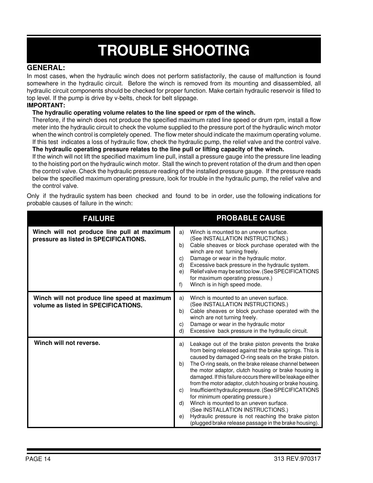 somewhere in the hydraulic circuit. Before the winch is removed from its mounting and disassembled, all
