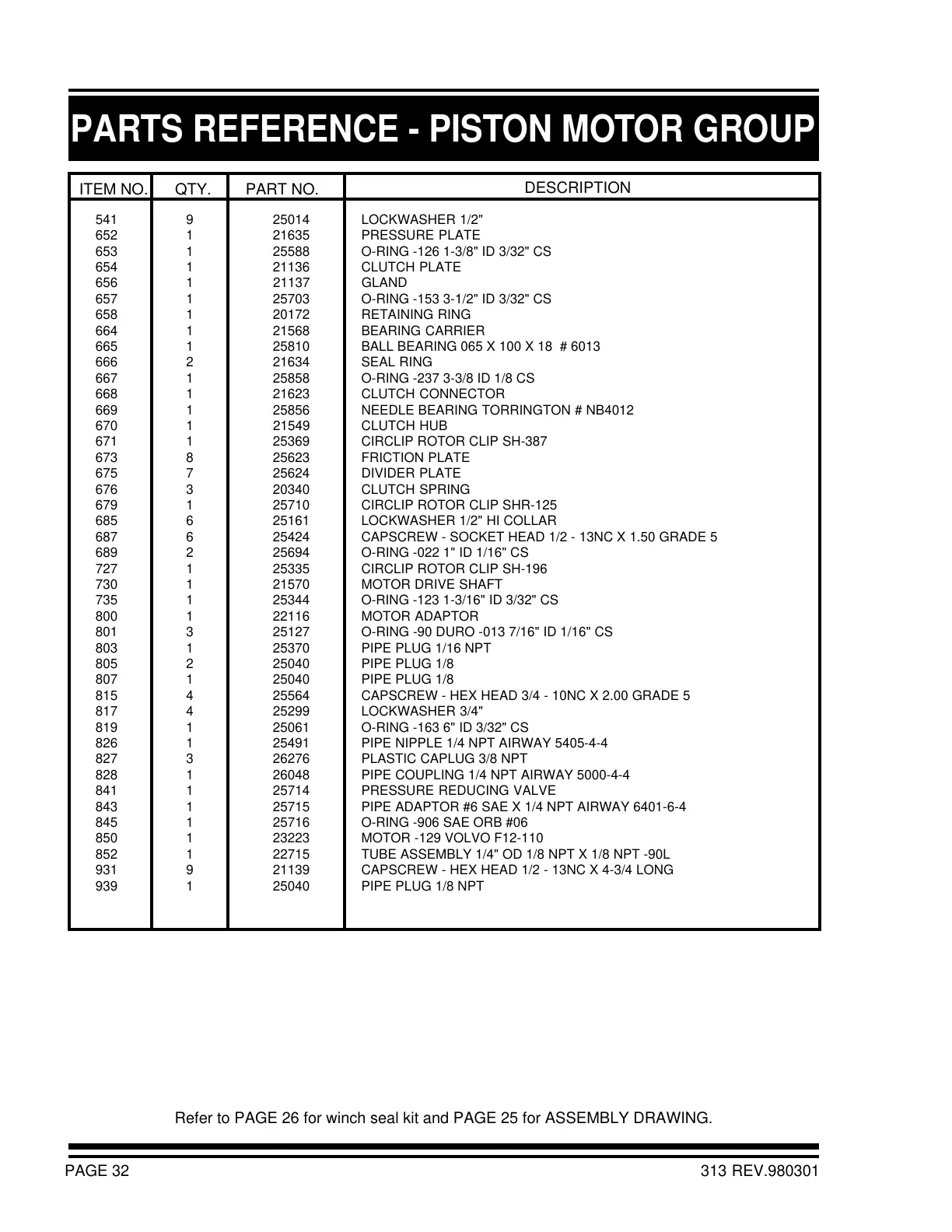 Refer to PAGE 26 for winch seal kit and PAGE 25 for ASSEMBLY DRAWING.