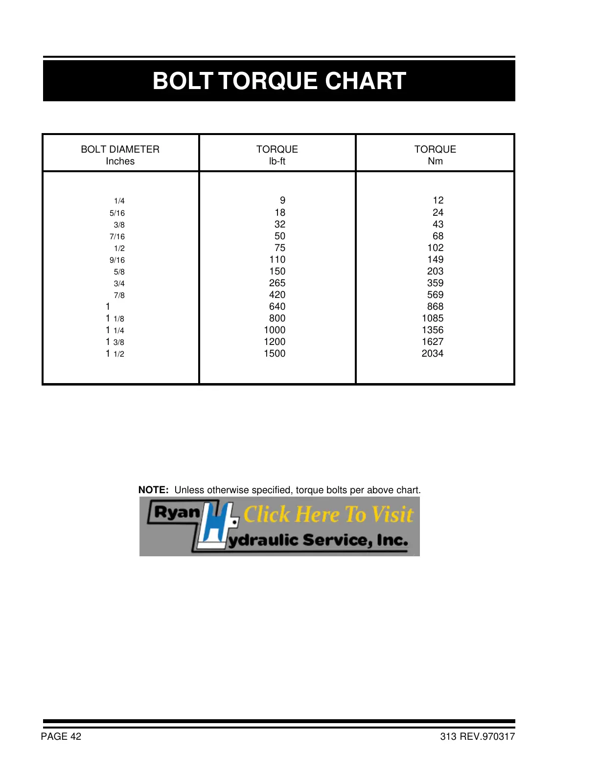 NOTE: Unless otherwise specified, torque bolts per above chart.