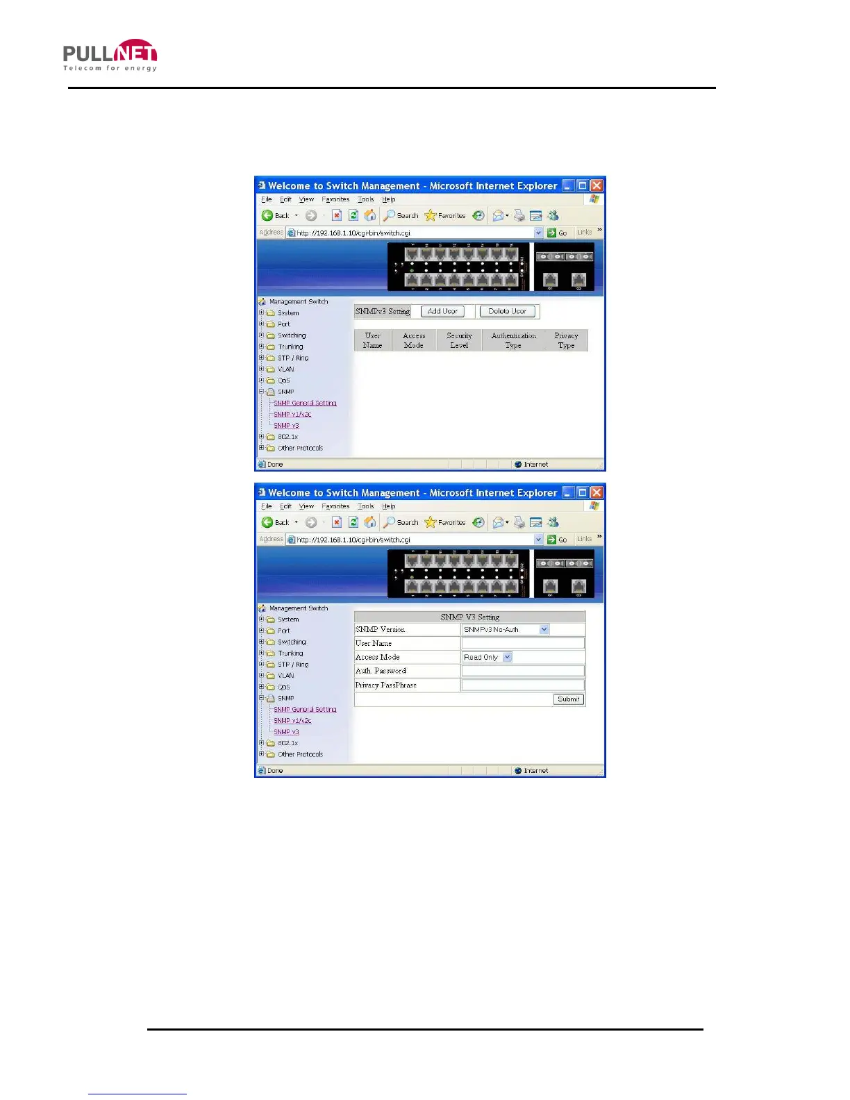 1. Add User: Click on the “Add User” button. The “SNMP V3 Setting” window is