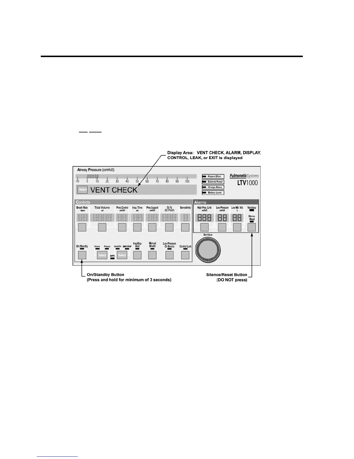 2) Turn the ventilator off by pressing and holding the On/Standby button for a minimum of 3