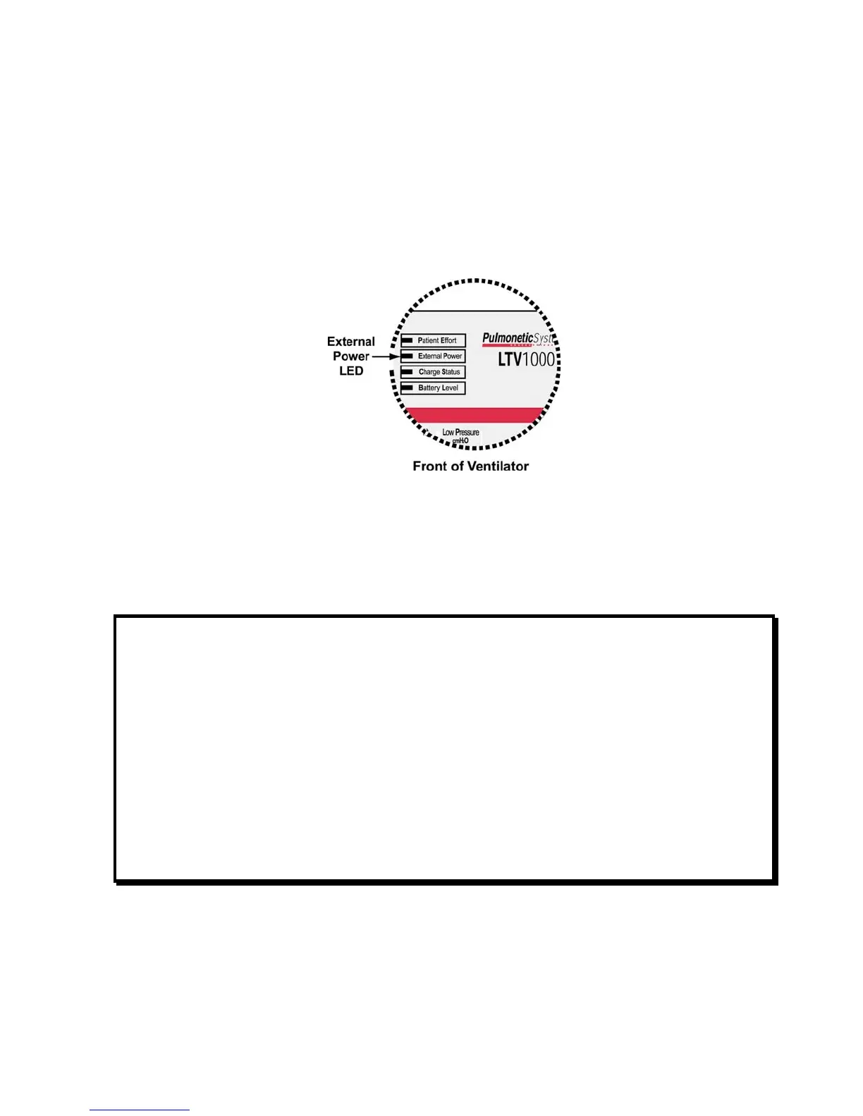 • The vehicle battery is powering the ventilator if the EXTERNAL POWER LED shows green.