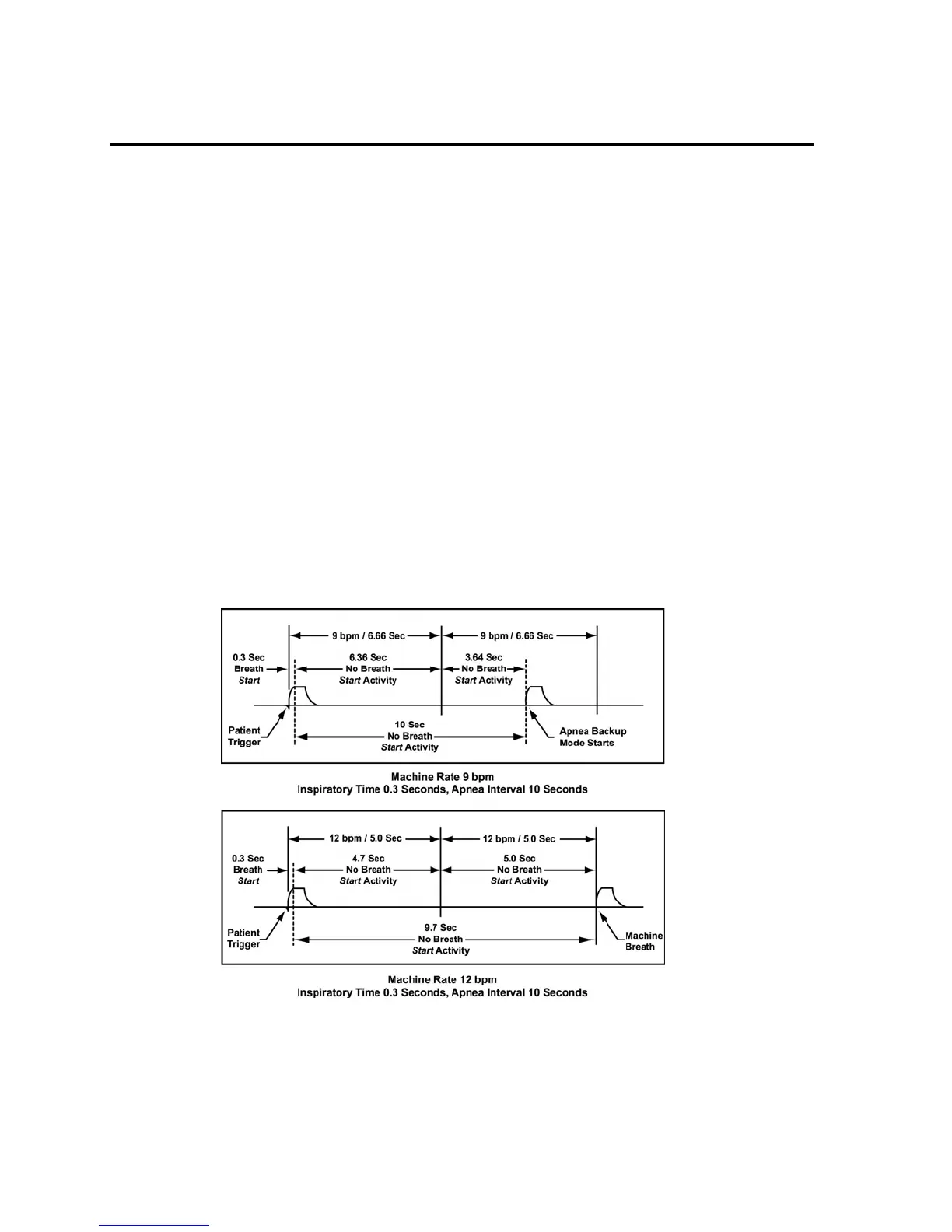 • The ventilator begins Apnea Backup ventilation in the Assist/Control mode according to the